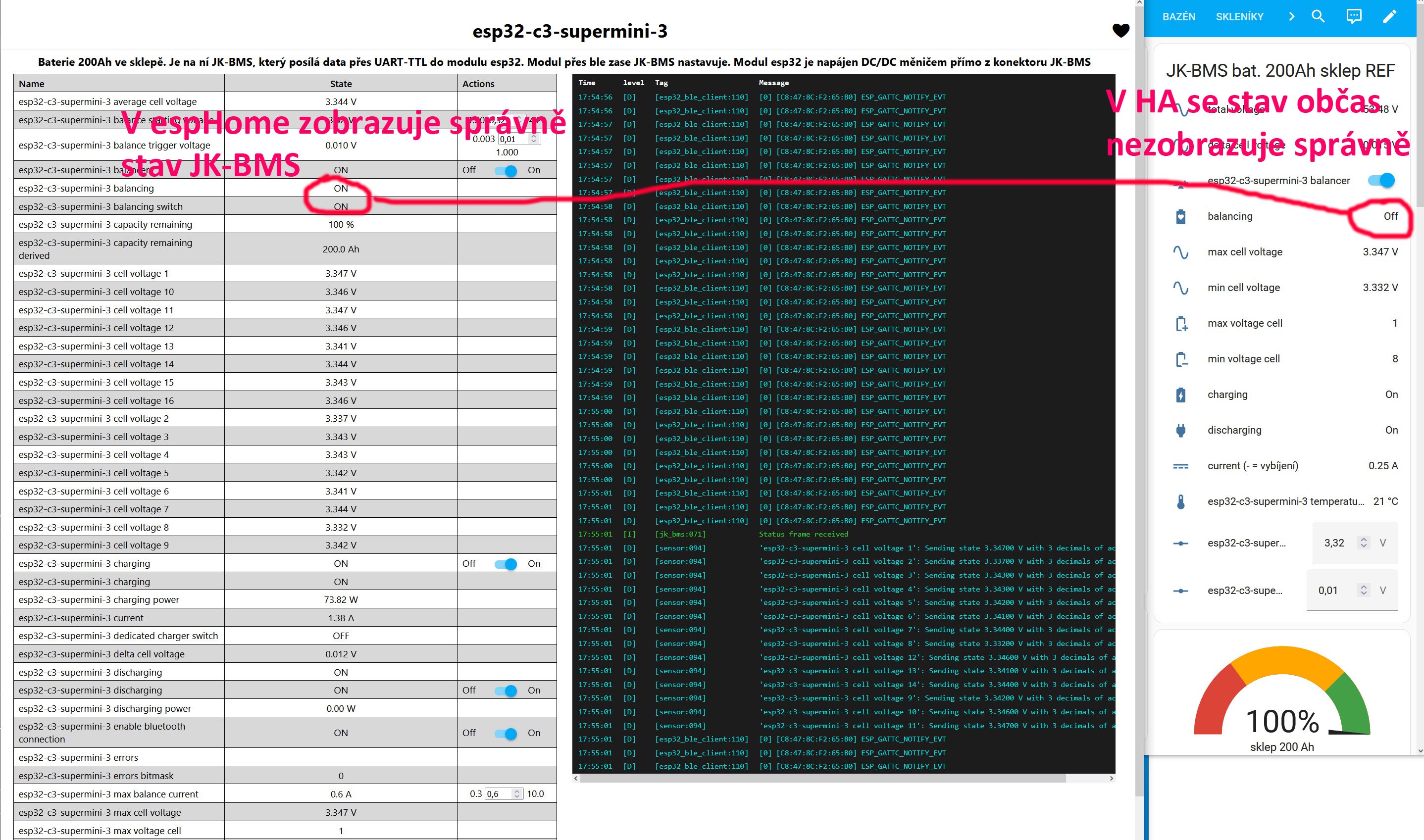Zobrazované hodnoty v HA se někdy liší od hodnot z ESPHome a správné jsou ty v ESPHome. Jsou splněny podmínky pro balancování, dle ESPHome se balancuje, ale HA chybně zobrazuje, že ne.