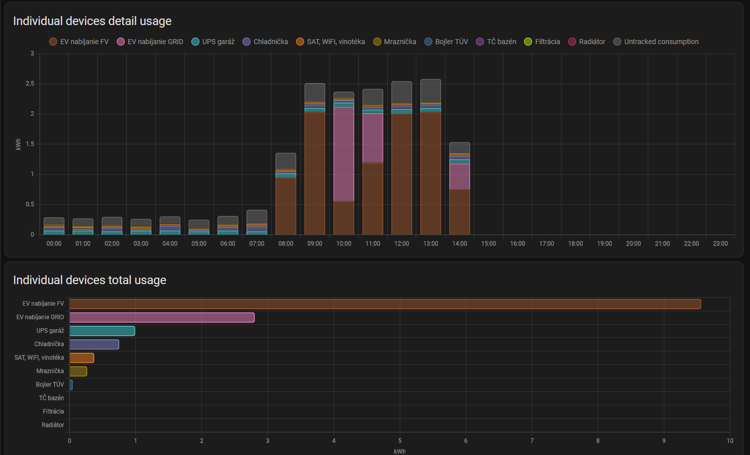 Mám jednu smart zásuvku v ktorej je nabíjačka na auto. Chcel som rozlíšiť koľko energie išlo z FVE a koľko zo siete (menič v bypasse). Použil som dva zdrojové senzory - "inverter state" = off-grid / bypass, a aktuálny výkon zo zásuvky. Bolo treba vytvoriť dva template senzory: