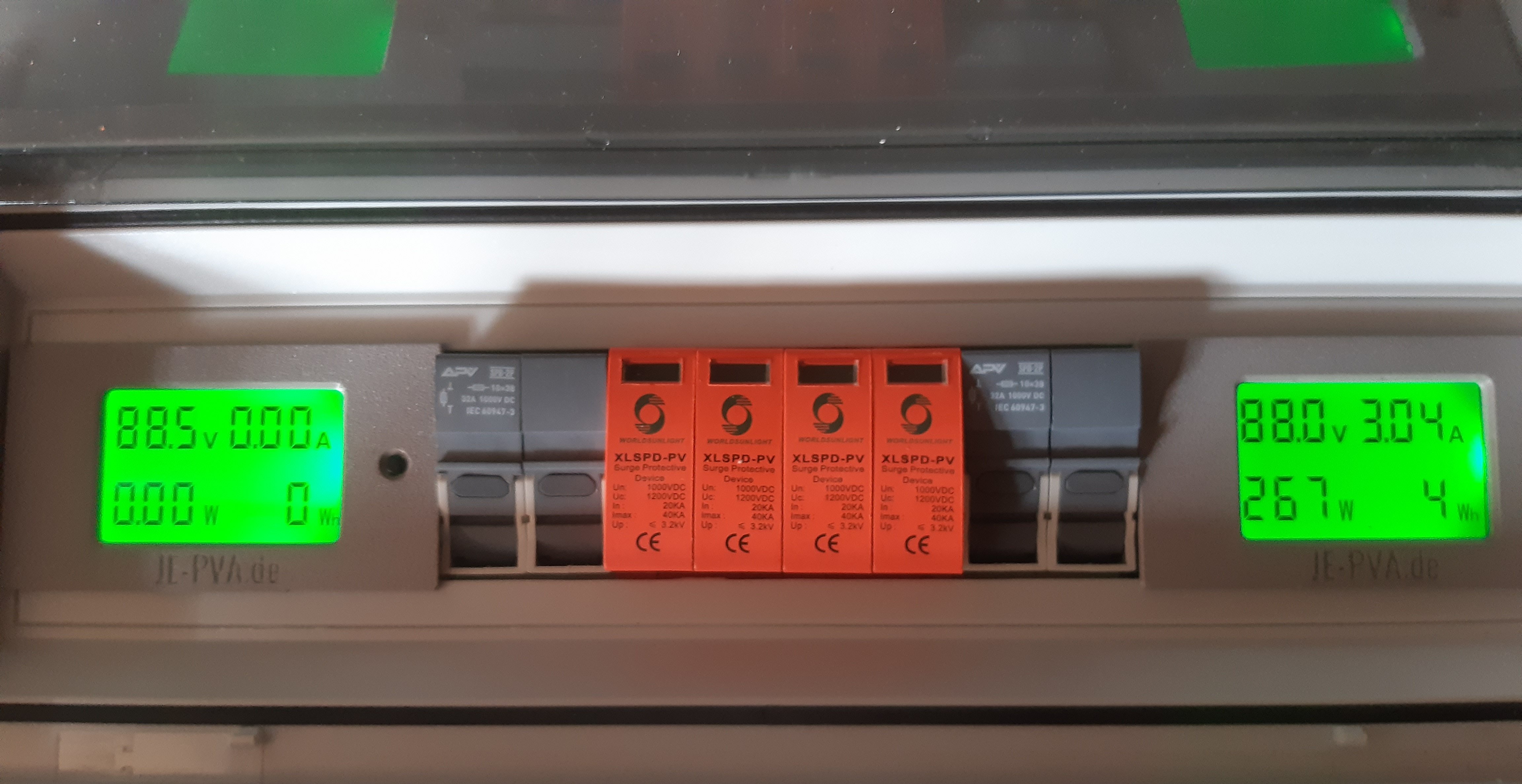 Měřák zelený do DC 300V, funguje bez úprav ale měří jen do 999kWh, měřák barevný