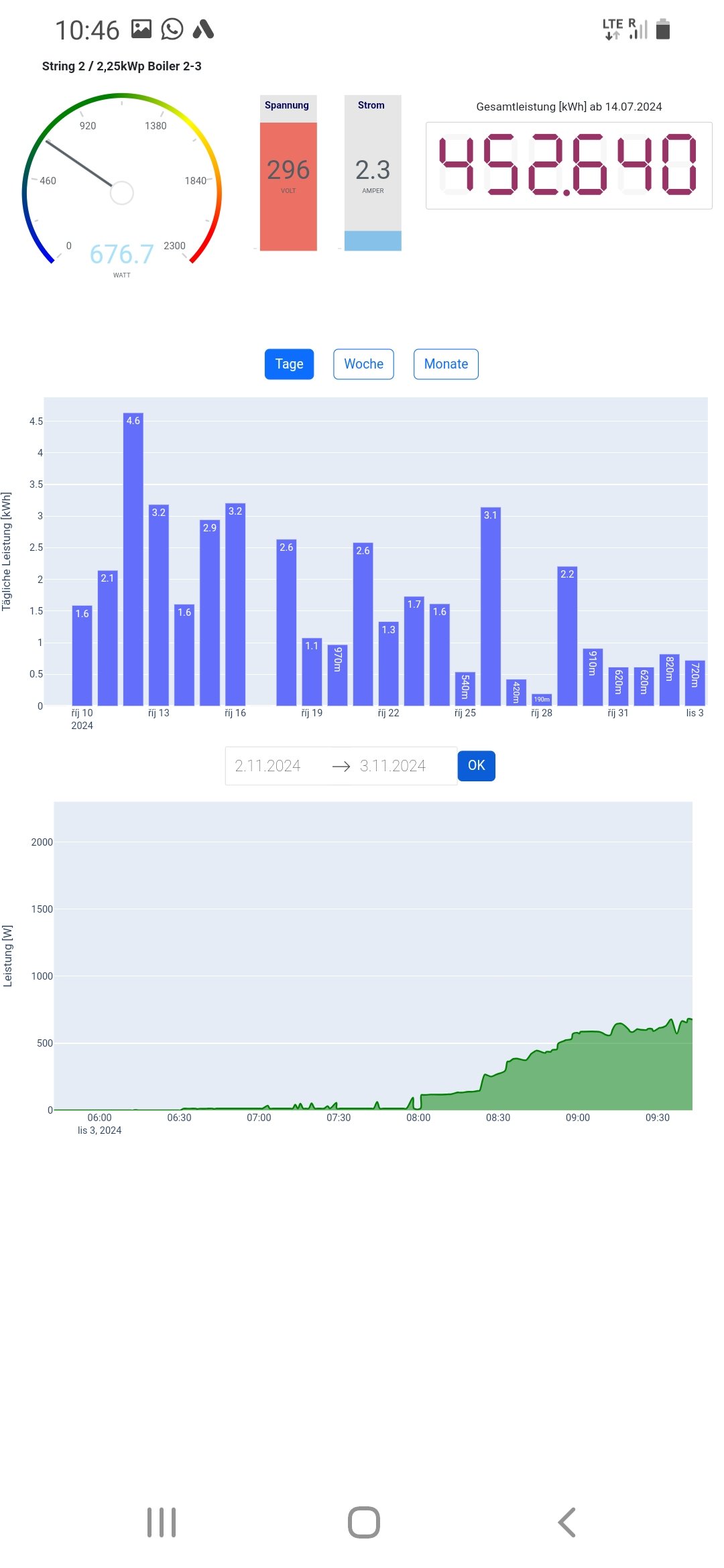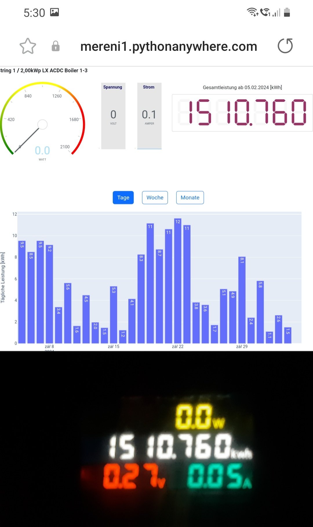 I přes částečně nefunkční wi-fi vidím výkon na vzdálenost cca 400km na záložním měření, stále je funkční alarm na 80°C a také možnost vzdáleného odpojení celé FV.