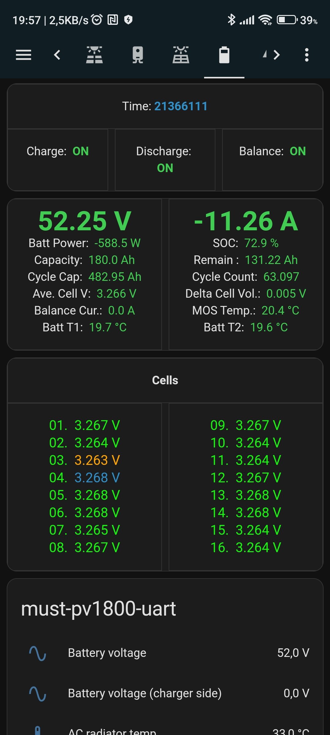 2x MUST PH1800 5.5kW, 9kWp V+J+Z, 600 Ah LiFePO4 s BMS JBD 200A, SW: Home Assistant na Synology DS923+ ku tomu ESPHome, Tasmota, MariaDB, InfluxDB, Telegraf, Grafana, Zigbee2MQTT..., HW: ESPlan (ESP32 + LAN 8720 + RS485). Nejaké moje projekty: MUST-ESPhome, ELTEK Flatpack2 ESPhome, ESP32-EMON, PZEM-017@WiFi, diyBMS-CurrentShunt-ESPhome , BMS UART-TS485 adaptér
