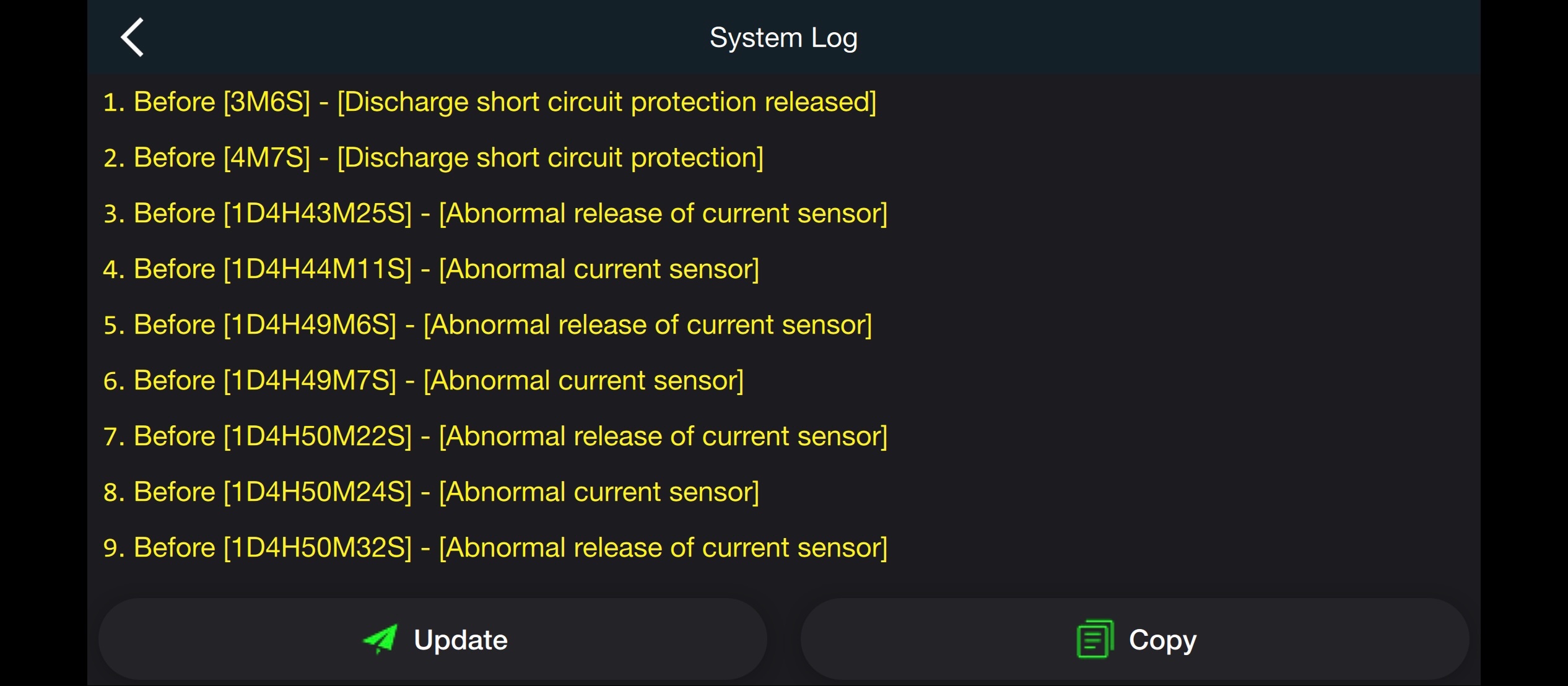 Ve screenshotu logu není vidět alarm, který by způsobil to on off on, ale je tam hláška na nesmyslná data z proudového senzoru, takže může být, že ten nadproud byla jen chyba měření bms.