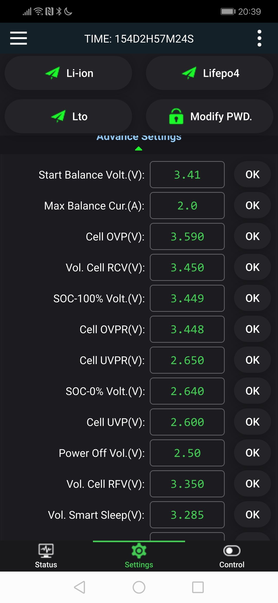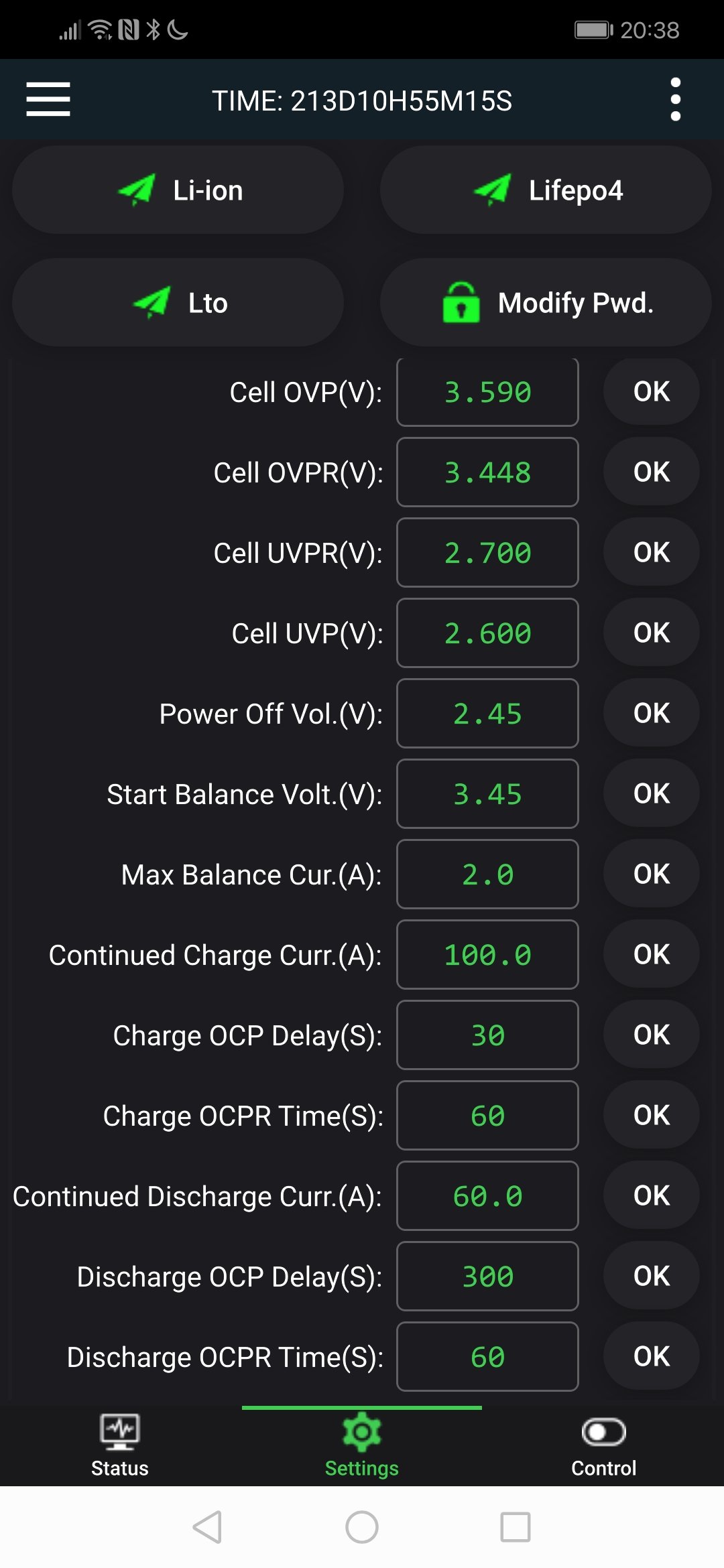 Zkoušel jsem měnit nastavení, podle diskuzí co jsem našel hlavně na DIY foru, tady a někdy na YT, ale úplně bez efektu. Problém je stejný při nabíjení z MPPT i z DS. Navíc se stává, že třeba 1x týdně těch 55V přeleze, ale defakto na sekundu a hned vypne nabíjení na 0A a už nezačne, dokud není baterka vybitá pod cca 53V.