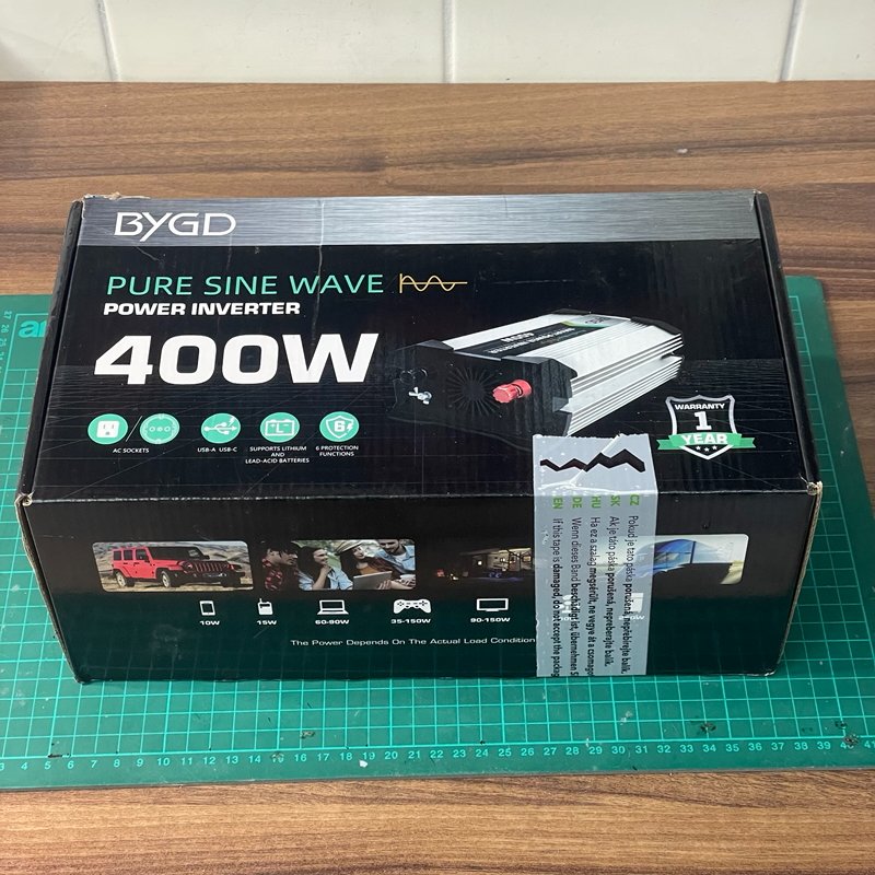 Nabízíme měnič napětí 12V na 230V s výkonem 400W a čistou sinusovou vlnou značky BYGD. Měnič je plně funkční po opravě, podporuje olověné i LiFePO4 baterie a disponuje ochranou proti přepětí, přehřátí a vybití baterie. Součástí je také USB konektor a aktivní ventilátor, vhodný pro použití s autobaterií. Možnost osobního odběru v Chomutově nebo zaslání kurýrem.