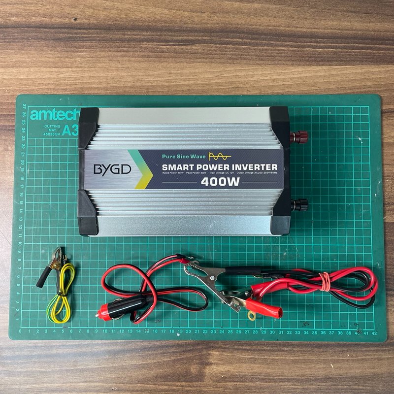 Měnič napětí 12 V na 230 V, čistá sinusoida, výkon 400W (max 520W), připojení na autobaterii, Aktivní ventilátor, Ochrana proti přepětí, Ochrana proti přehřátí, Ochrana proti vybití baterie, USB konektor