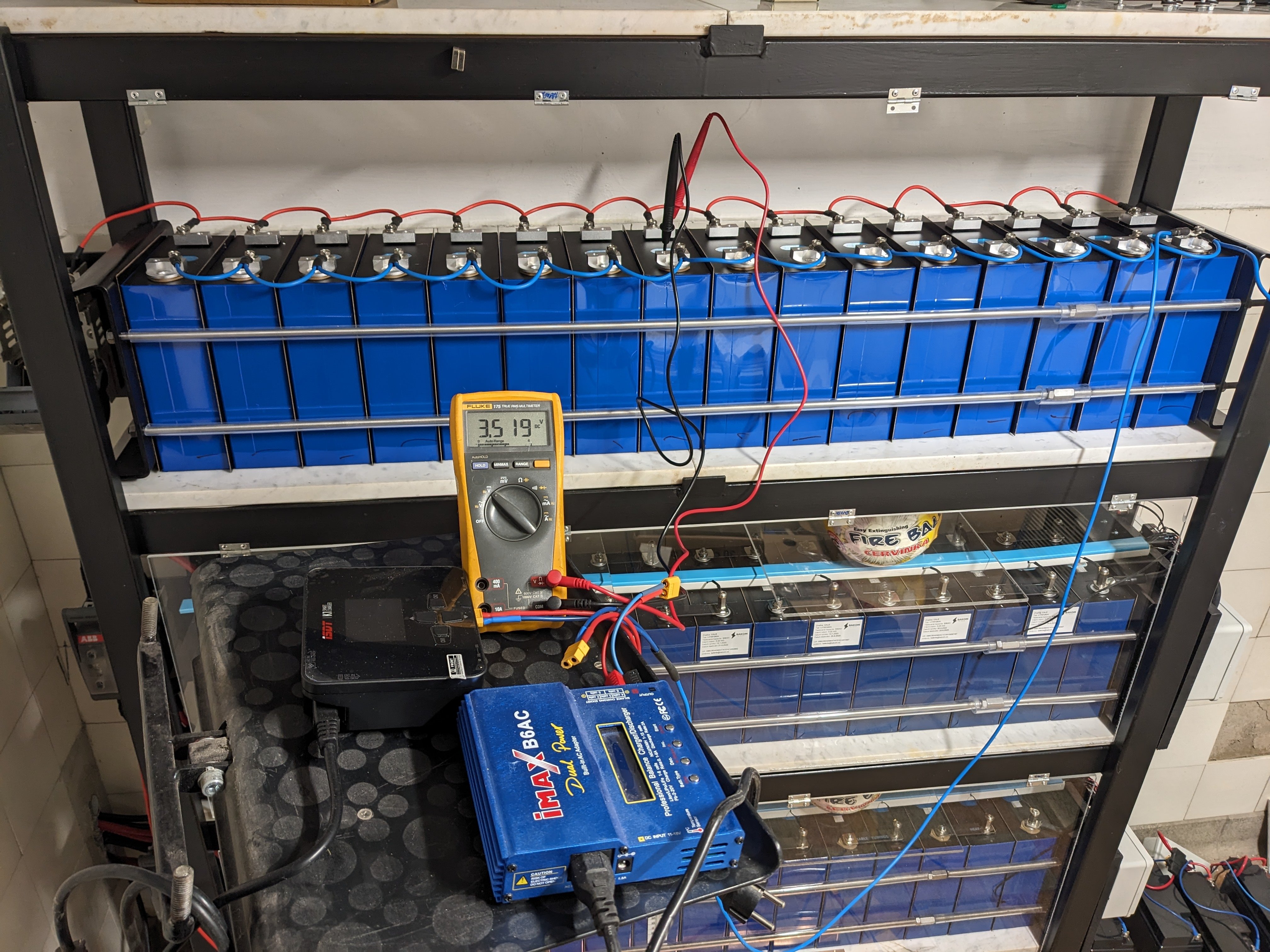 Zrovna jsem rozebral baterii abych využil doby, kdy se stejně moc nezasvítí a chtěl jsem ji srovnat. Zapojil jsem 16x 295Ah paralelně (předtím byli plně nabité) Ale už asi tejden to dostávám z napětí 3,34 na aktuálně 3,37V. Co mě překvapilo Už od počátku to nejelo na plno ale jen na 7A a v tuto chvíli to jede na 4,7A.