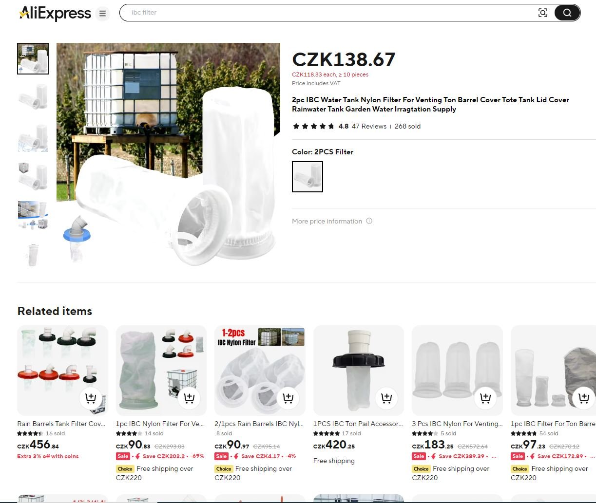 Mám 2 kubíkové IBC nádrže a pak 2 menší po 250 litrech. Teď jsem si koupil ještě 2-kubíkovou nádrž k zakopání, ale zatím jsem ji neosadil a nepoužil.el_salvadore píše: čtv pro 12, 2024 6:01 pmTato tema ma dost zaujma, sam planujem rozvod dazdovej vody ako uzitkovej v domacnosti (splachovanie, pranie) avsak narazil som trochu na problem filtracie. Vedel by si prosim Ta nacrtnut ako to mas riesene ty? Celkovo zachytavanie necistot od dazdovych zvodov az po filtre ake pouzivas?Mex píše: stř pro 11, 2024 9:28 pmPereme v přefiltrované dešťovce, která je ve venkovní nádrži. ...