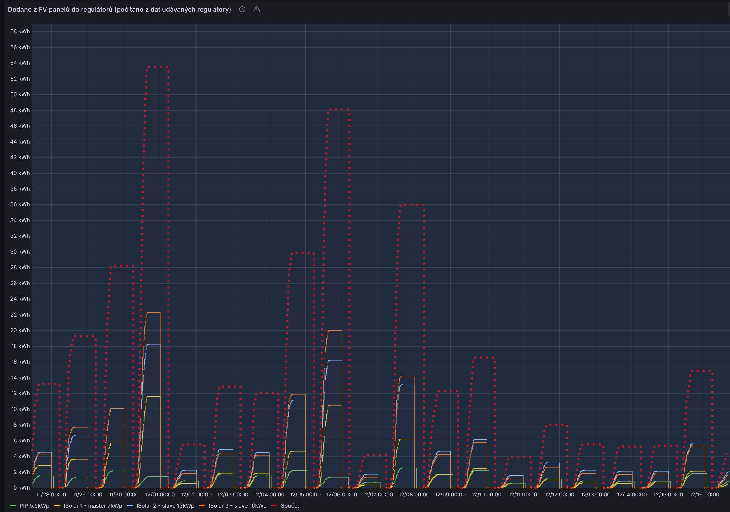 Průměrná spotřeba elektřiny v rodinném domku je dle https://www.lamaenergy.cz/zajimavosti/j ... neho-domu/ cca 10 kWh denně. Máme teď výjimečnou solární tmu, kdy se moc nevyrábí. Ale přesto by taková rodina s mojí elektrárnou vystačila i bez distributora. Pokud někdo má vhodné podmínky k tomu, aby se stal méně závislým na dodavateli, tak je škoda, pokud této své výhody nevyužije.