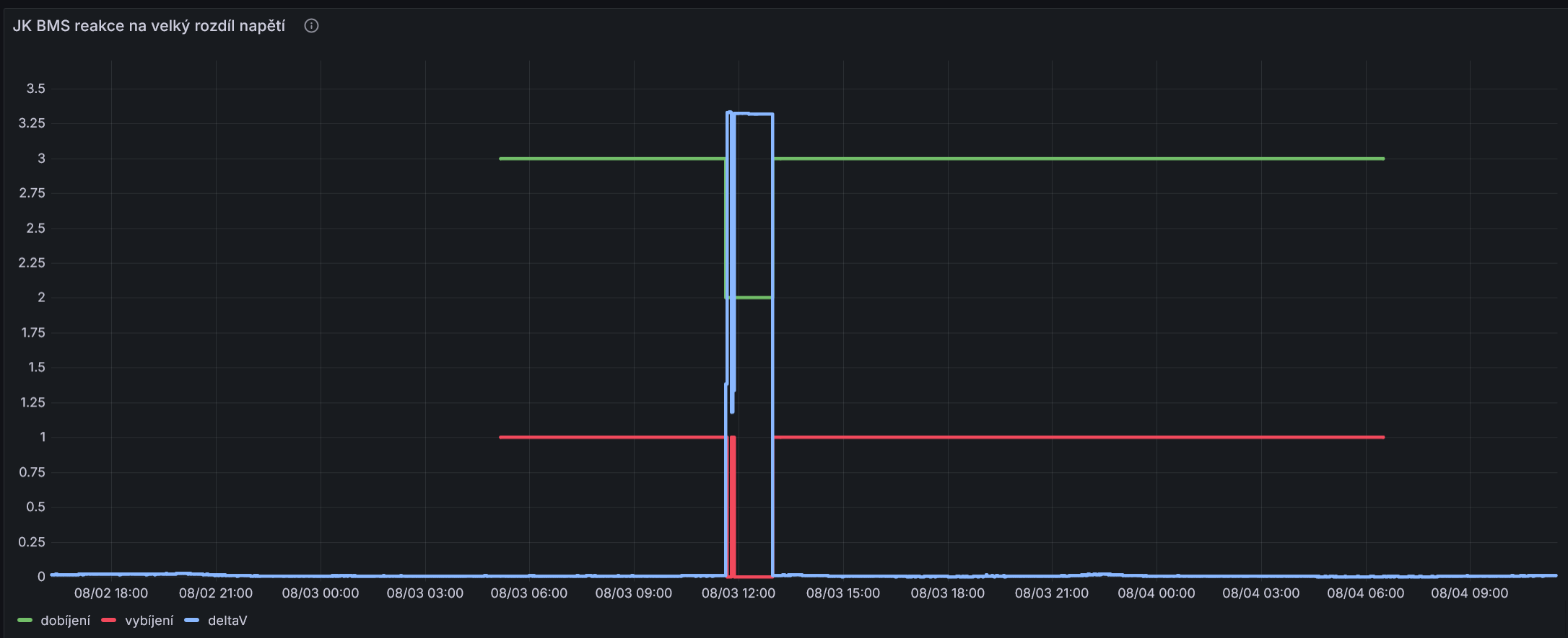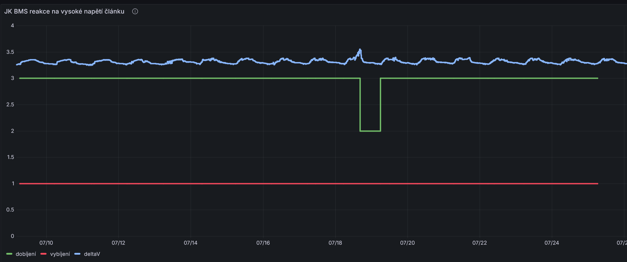 1. Pokud max delta V mezi články překročí nastavenou mez, tak JK BMS vypne jak nabíjení, tak vybíjení. Když se to vrátí k normálu, zapne je zpět: 2. Pokud některý článek překročí přednastavenou mez, vypne se jen dobíjení, ale vybíjet baterii jde. Jakmile napětí přebíjeného článku poklesne, zapne se znovu i dobíjení (modrá barva je maxV a ne deltaV):