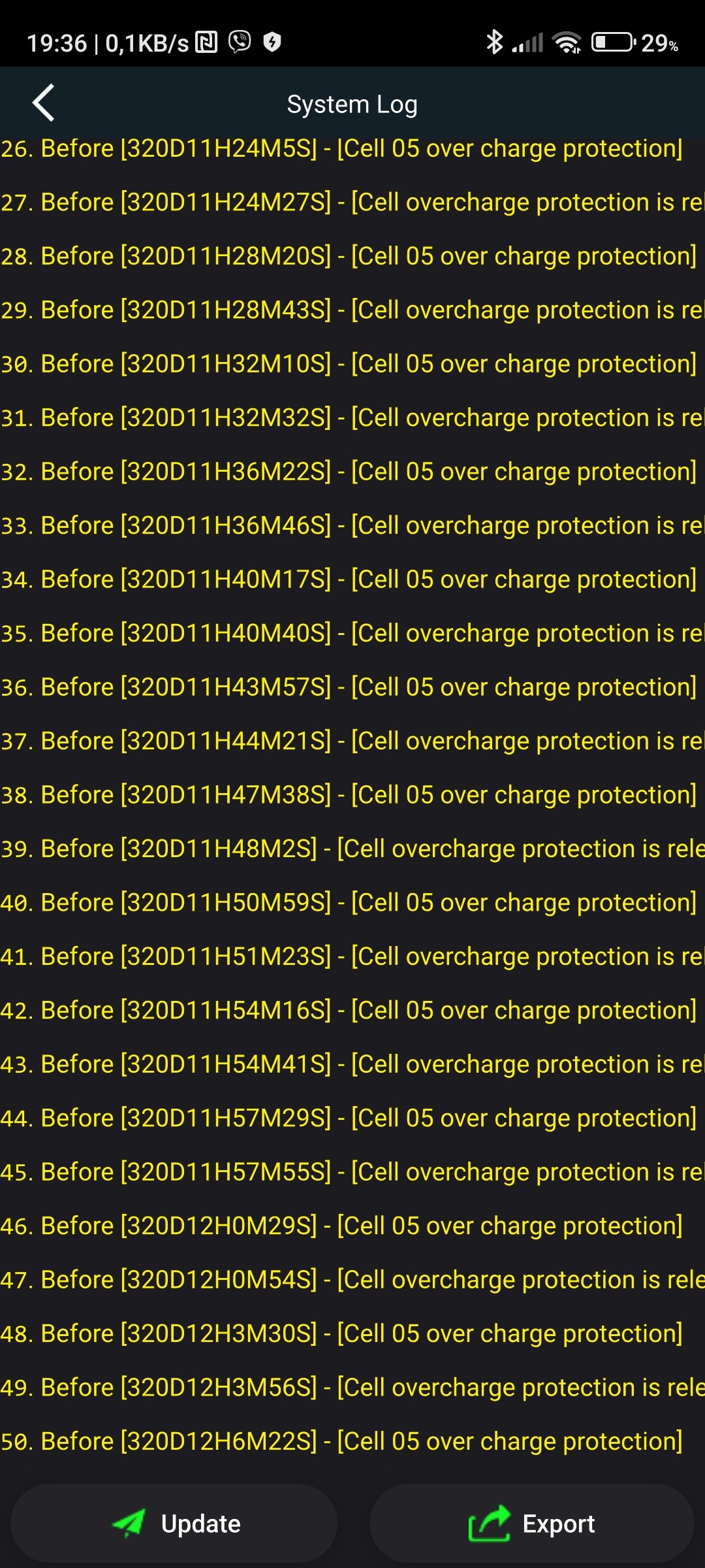 jk bms ma svoj interny log, pristupny cez app.Ráno jsem zjistil celkem hned,že BMSka celou sekci(1/5kapacity)odpojila už kdoví kdy kvůli vadnému článku.