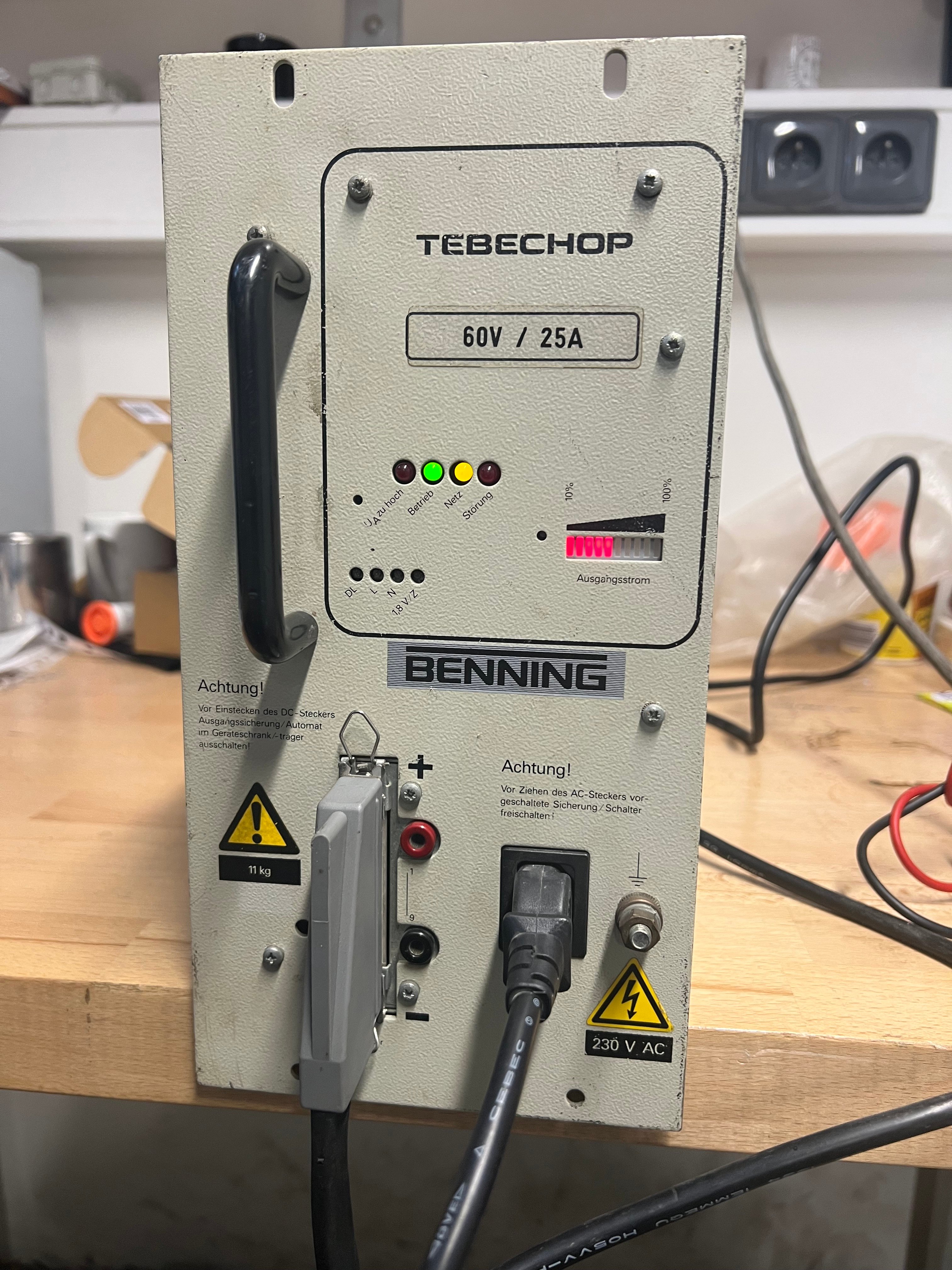 K prodeji jsou německé zdroje Benning TEBECHOP 1700 s výstupním napětím nastavitelným od 42 do 73 V a proudem 25 A. Zdroje mají signalizaci provozu, sítě, poruchy a přetížení, jsou odzkoušené a vhodné pro nabíjení Pb i NiCd baterií. K dispozici jsou aktuálně 3 kusy za cenu 2500 Kč za kus.