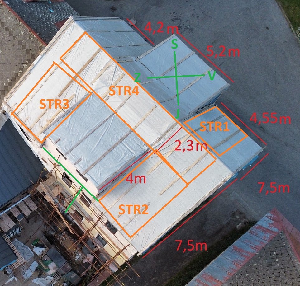 16+ kWp: 9850 Wp Jih, 2040 Wp Východ, 1490 Wp Západ, 2700 Wp mikroinvertory
