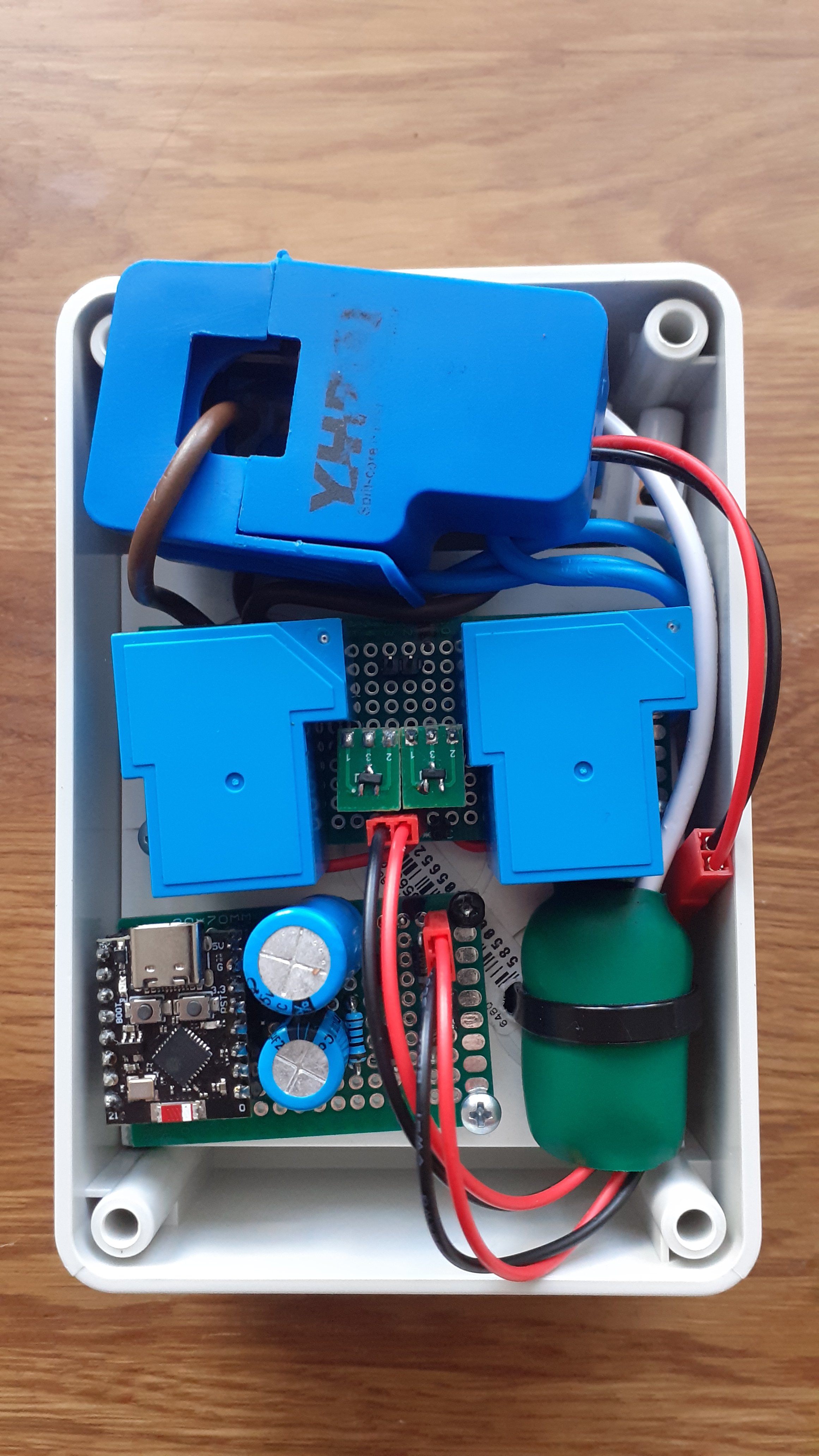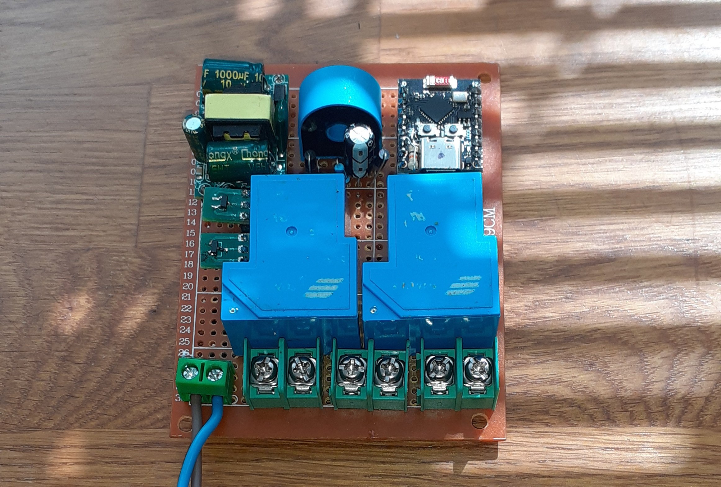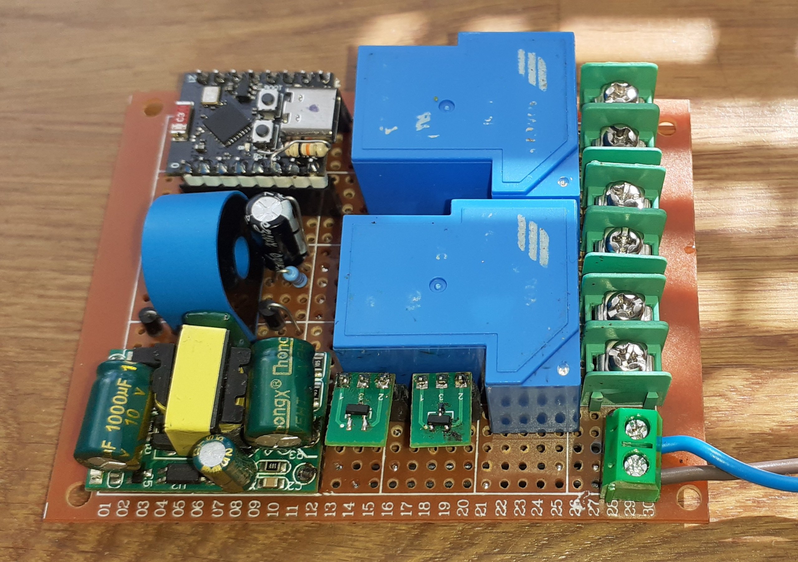 Zariadenie je postavené na mikrokontroleri ESP32-C3. Napajanie ESP32 a cievok rele je poriesene mini spinanym zdrojom 5V. Odber prudu sa meria pomocou prudoveho transformatoru a vyhodnocuje sa na ADC vstupe ESP32. Rele su spinane mosfetmi ktore su ovladane z pinov ESP32, obsluzny softver je ESPeasy. Funguje to nasledovne.