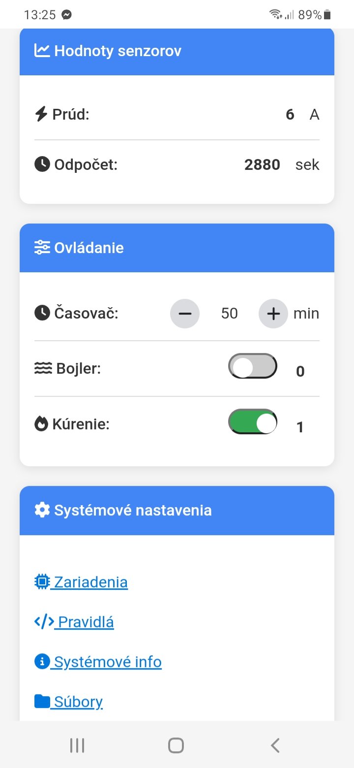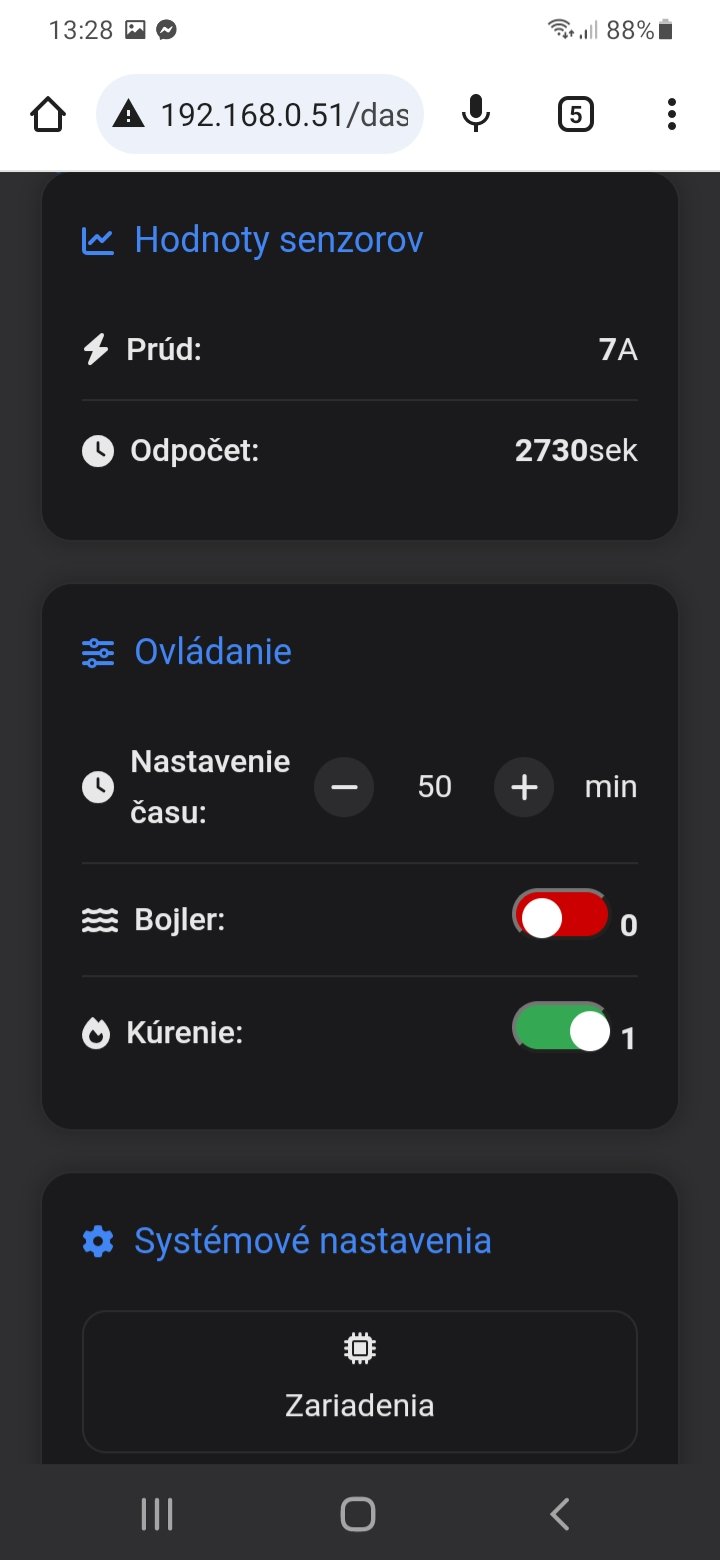 Dnes som si urobil ovladaci panel (dashboard) pre mobil, aby aj manzelka vedela ovladat prepinac. Daju sa natvrdo prepinat vystupy mimo automatiku, a nastavit casovac