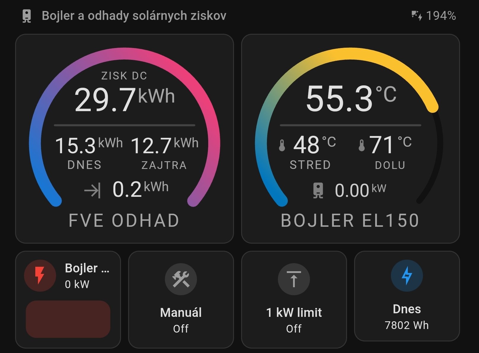 NádhernéTomHC píše: čtv dub 17, 2025 7:19 pmNa ohrev bojlera nemám žiadne tlačítko, ale automatizácie podľa rôznych pravidiel. Ale mám tam switch na manuálny ohrev a slider kde si viem nastaviť výkon 1-2-3 kW.
