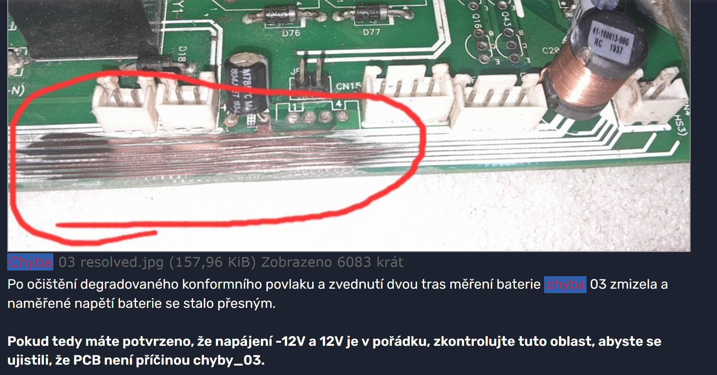 Nedávné 2 jednotky selhaly s chybou 03 , napětí baterie 120V. Díky tomuto fóru se to podařilo vysledovat až k C116 100uF/25V před LM7912. Vyměněn a měnič se znovu objevil.