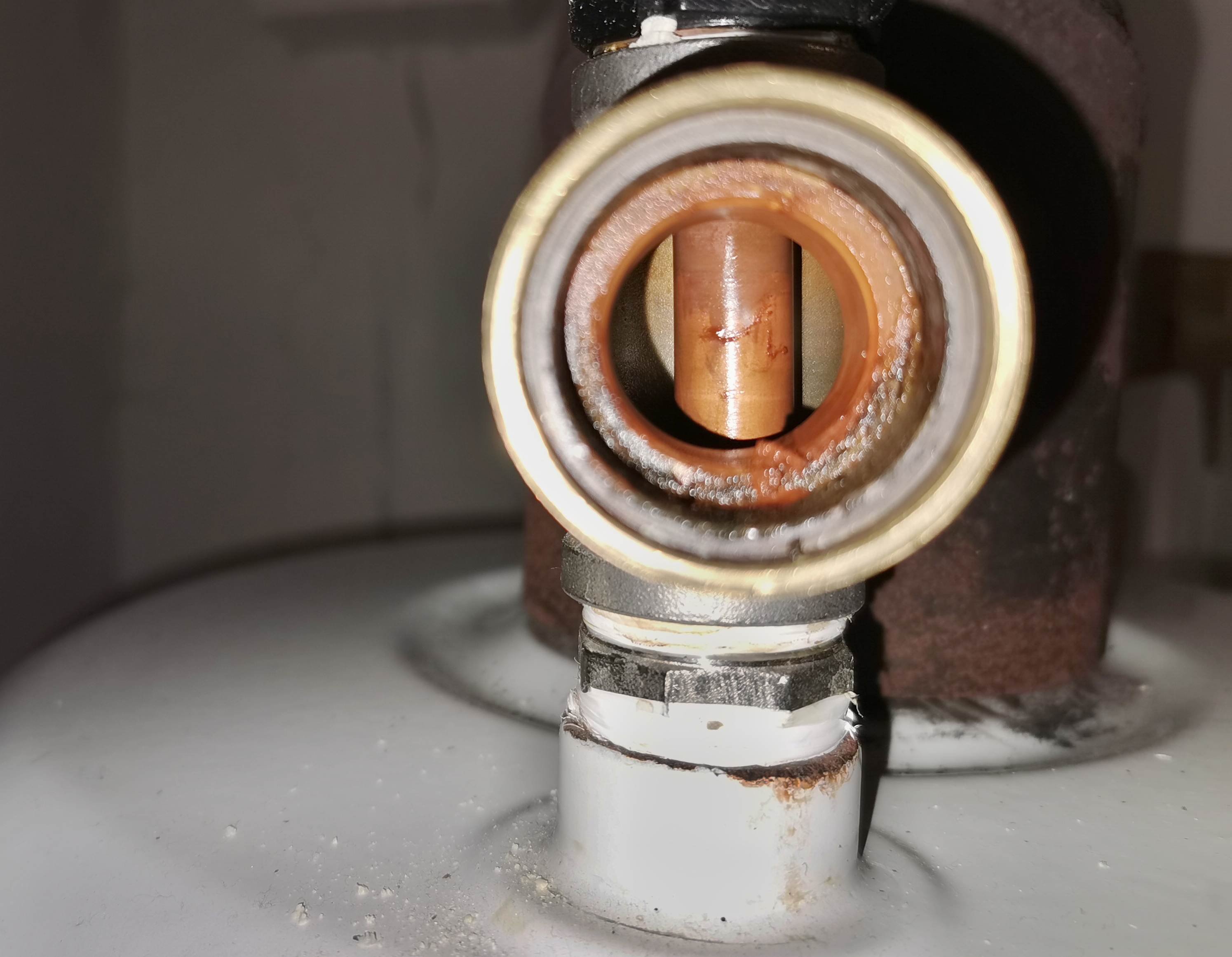 3. Topná spirála byla docela hodně obalená vodním kamenem, to ano. Ale pokud vezmu do úvahy fakt, že spirála je v provozu 35 měsíců - já jsem spokojen. 4. Spirálu šlo mechanicky docela dobře vyčistit. Na chemii bych to musel vymontovat a to je dost složité, tak předpokládám, že to zase za 3 roky rozeberu. 5. Pohledem do "expanzní nádoby" zjistíte, že ta měděná trubka, výpusť teplé vody je v podstatě úplně bez vodního kamene!! Super. 6. Trubka, ve které se topí byla logicky zanesená, ale pro mne bylo dost překvapení, že ten vodní kámen byl spíše jako vodní bláto. Byl jsem připraven na to, že jej budu lámat, brousit, štípat. Místo toho stačilo jej očistit. Asi ty Dražice fakt fungují, protože domácí hrnce musím pravidelně odvápňovat kyselinou citronovou. Fotil jsem to ve stavu před čištěním, to uprostřed je ještě spirála a to okolo není vodní kámen, jen šroubení... Bohužel jsem nevyfotil trubku po vyčištění, musíte mi věřit
