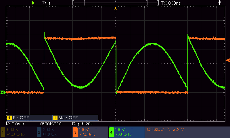 Jinak nemyslim si, ze by vypadavani chranice typu B nutne muselo znamenat nejakou zavadu. Spis se divim, ze nekdy drzi a nevypadava. Ten vystup ze stridace totiz neni vuci panelum ani sinusovy, ani symetricky. Pres parazitni kapacitu panelu vuci zemi tam musi tect znacne proudy. Viz prubeh z osciloskopu.