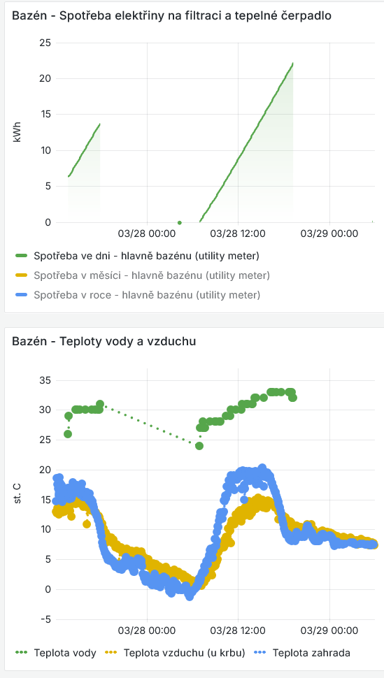 Ten vypocet je ultrajednoduchy. Ked odignorujeme desatinne miesta, tak 1 kWh ohreje 1m3 o 1 stC. Ja mam cca 20 m3 vody v bazene. 2 kW teleso by ho ohrialo o 1 st za 10 hodin. Coz nepokryje ani nocne straty. Takze je to nezmysel. Siel som na to inak - uz s bazenom som pred x rokmi kupil mountfield TC, ktore som tento rok (po roku od instalacie FVE) doplnil o dalsie bazarove tc (bolo za par korun, nefungovalo, oprava zabrala 2h aj s diagnostikou (mal som stastie ze to bola len elektronika)). Teraz je to tak akurat. Pri tychto mizernych nocnych teplotach bazen strati tak 2-4 st za noc, a ja ich za cca 4-5 hodin behu oboch TC zase dohrejem. "Vytazuje" mi to cca 14A, coz je akurat na hranici istica co mam von na zahradu a zaroven je to cca polovica vykonu mojej fve. (a ked pride EV tak budem v prdeli