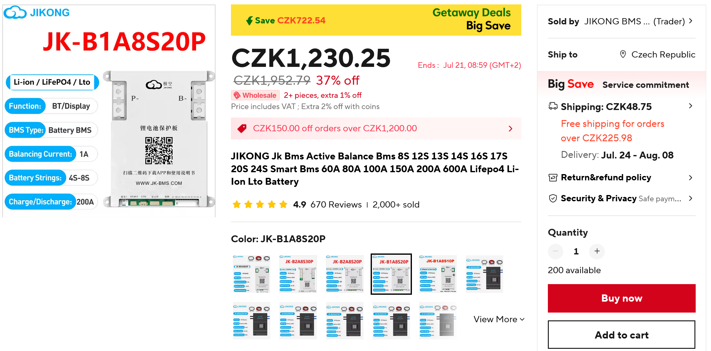 a k tomu připočti tak 4 000,- Kč za vhodnou JK-BMS + přívodní kabely. Namátkou něco jako je na obrázku. Ale klidně můžeš vzít i nějakou pro 8-24 článků s tím, že se chystáš přejít na 48 V systém. Za cenu té tvé baterie získáš takto asi 3x vyšší kapacitu a plnou kontrolu nad baterií.