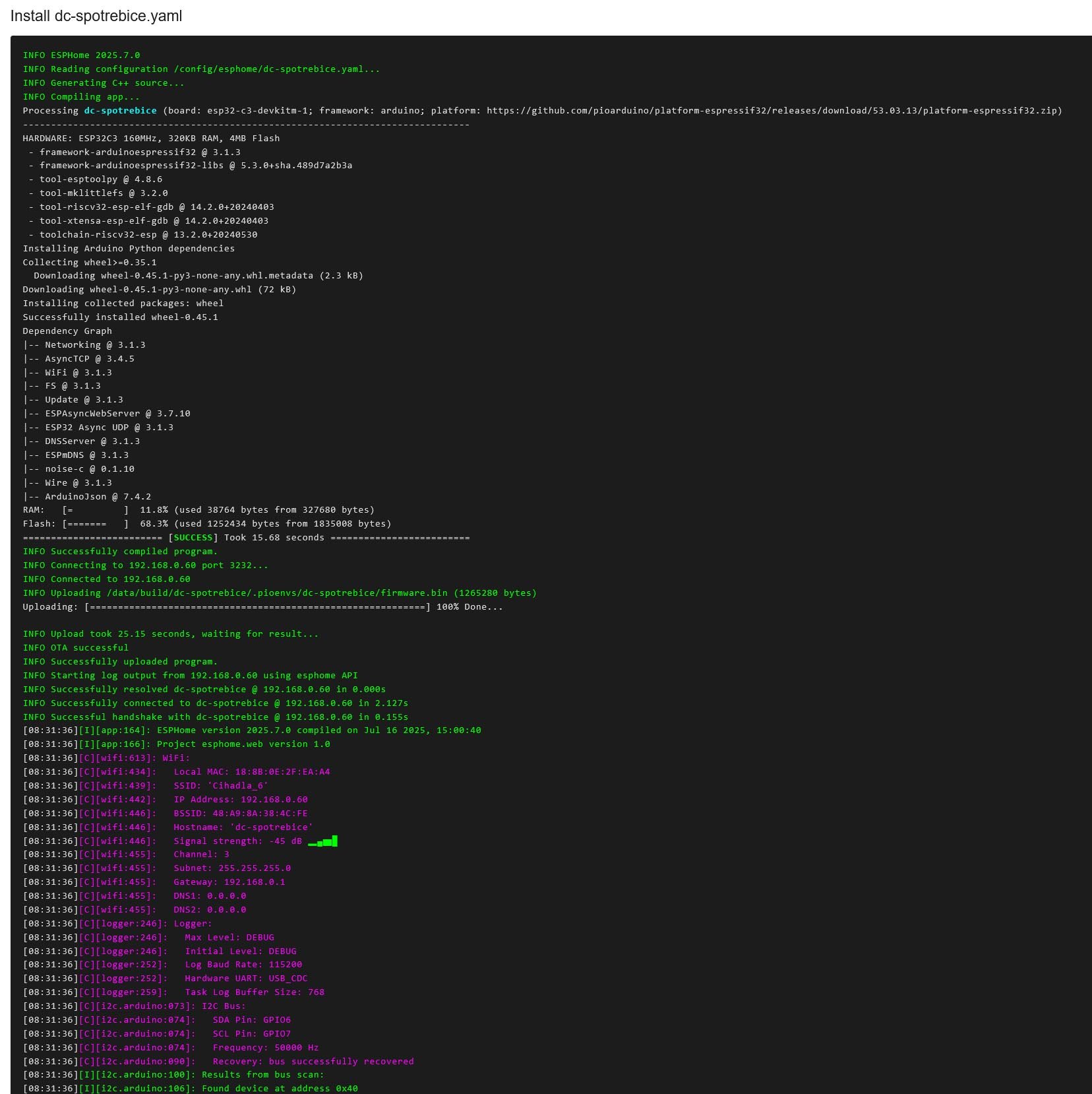 Problém s moc velkým souborem po kompilaci vyřešen dle aktuálního návodu pod chybovou hláškou - tedy přechodem v yaml z framework arduino na esp-idf: U mě zabírá stále větší místo databáze influxDB - přes 16 GB. Proto jsem si dle návodu v sekci "senzor" přidal senzor, který tuto velikost zobrazuje.