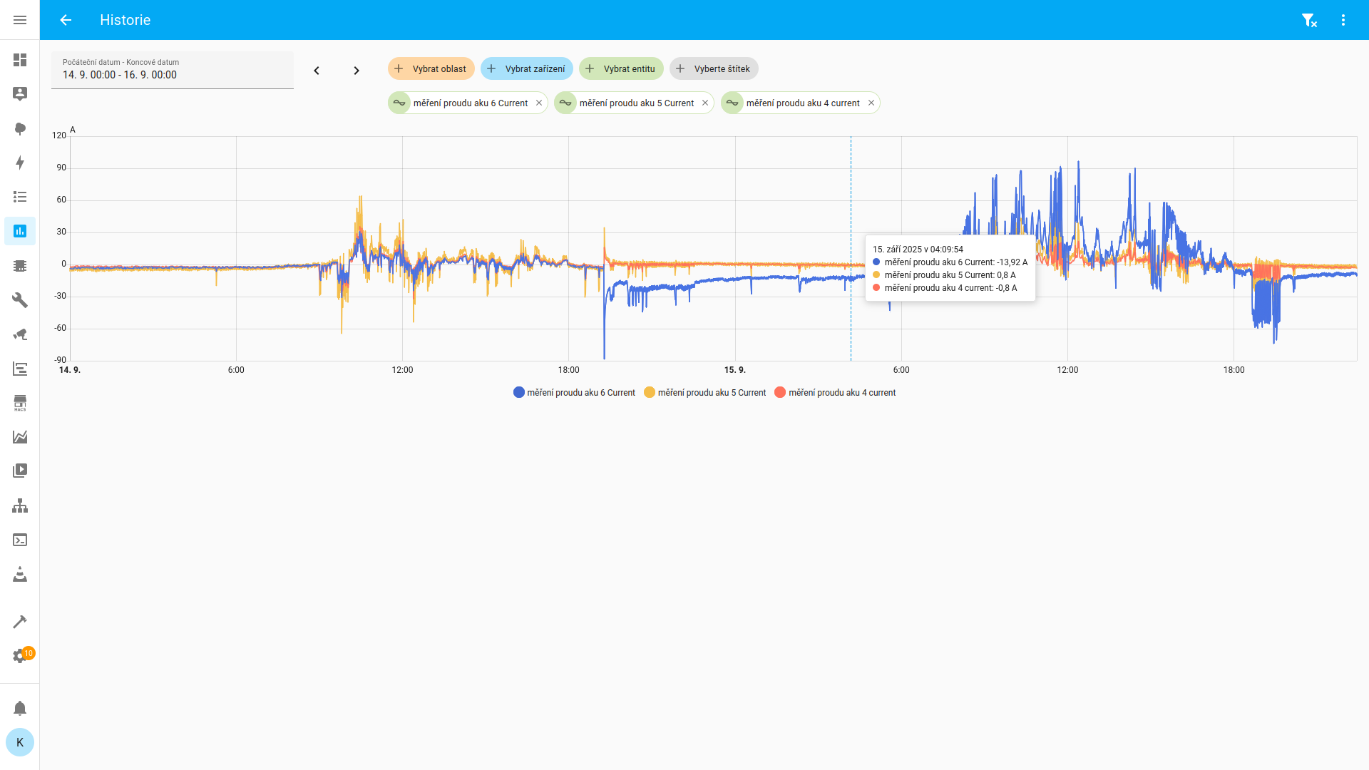 Tady je jasně vidět, že se na začátku v rychlosti něco málo přelilo z baterky do baterky, a že dnes přes den šla většina elektriky do té největší nové baterky, stejně jako při odběru dávají nejvíc ty nový... Jo a že jsem zrovna ukázal na místo s 0.8A a -0.8A z dalších aku, to je spíš nepřesnost měření, ona to byla +- 0 a všechno šlo z té nové.