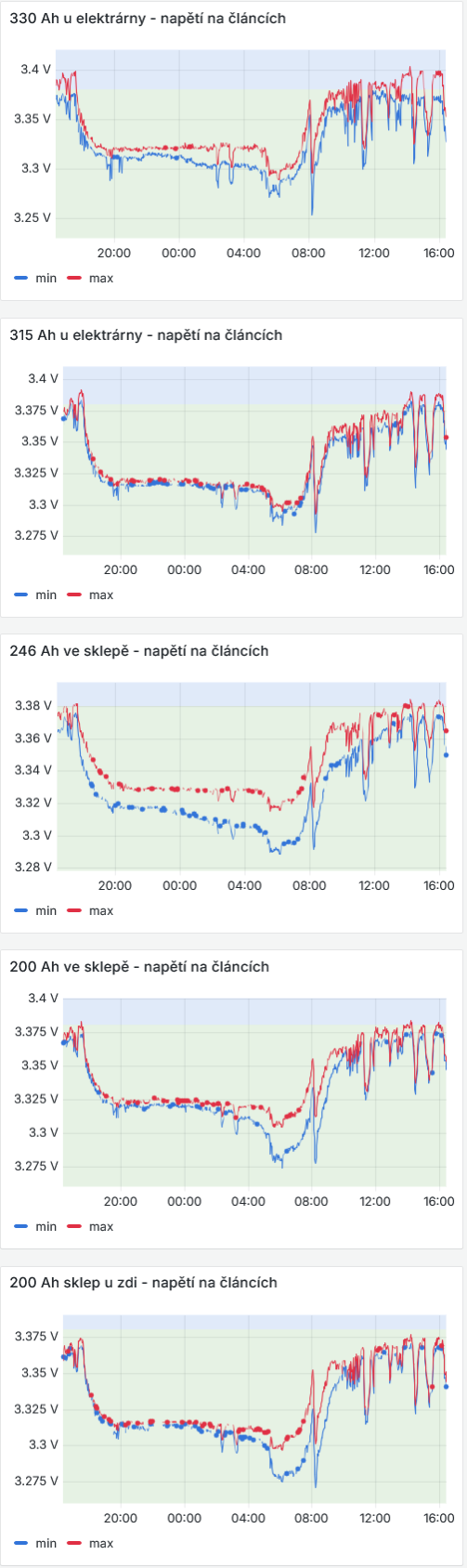 Já bych snížil jak bulk tak float (aktuálně to mám 54.4/54.2 V, v zimě to o něco zvednu, v létě jsem to měl ještě nižší). Obdobné měniče se občas chovají nevyzpytatelně a přecházejí z bulk do float a zpět. Pro orientaci u mých baterií se max a min napětí na článcích pohybuje během 24 hodin takto: