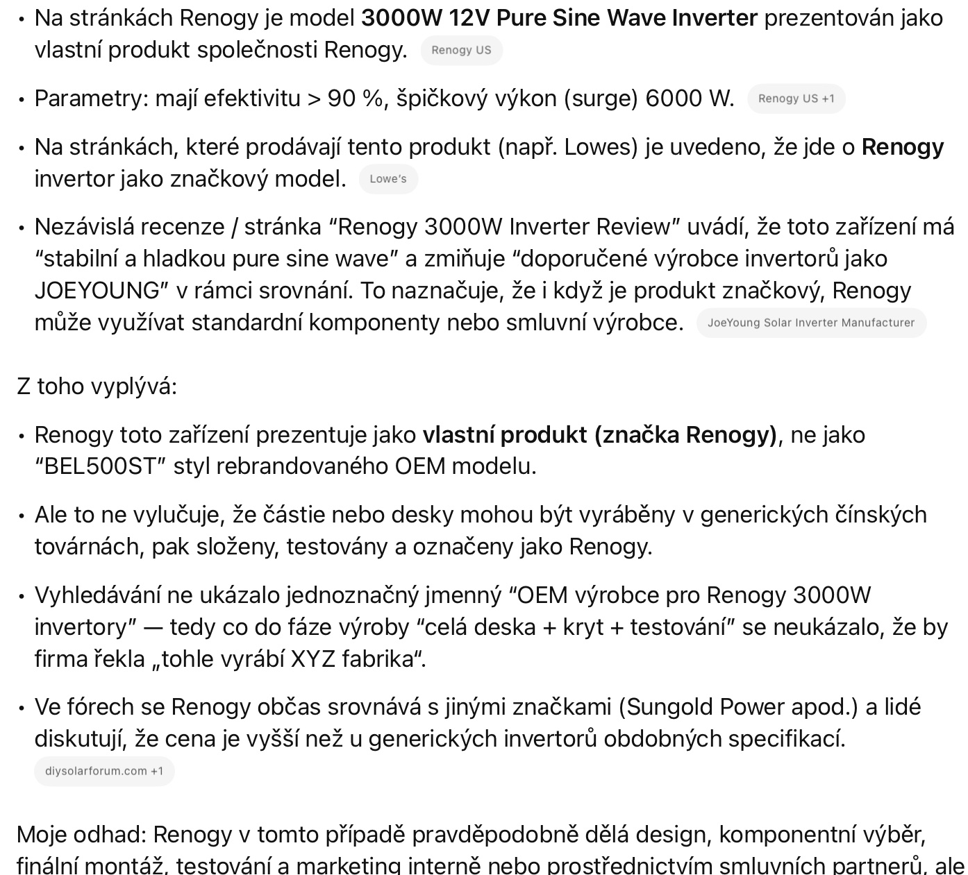 Navíc tady se primárně řeší spíš měniče k FVE pro statické instalace a specifické spíš mobilní měniče vámi zmíněného typu 12/230V do aut či karavanů jsou zde zcela okrajovou záležitostí. Takže tady na serveru k měničům tohoto typu mnoho informací ani zkušeností rozhodně nenajdete a nelze ani očekávat, že o to zde bude nějaký větší zájem, protože to tady je naprostá minorita jak ostatně už zmínil i PetrDubi. Pokud jsou tyto měniče pro vás prioritní tak se budete muset vy sám snažit si k nim shánět informace mimo tento server. Nějaká obecná doporučení k těmto měničům na tomto serveru dle mého názoru nenajdete, ale můžete je zde vlastním úsilím vy sám vytvořit na základě svého vlastního průzkumu. Zaměření na jednu značku Renogy zatím budí spíš dojem jakési potenciálně skryté reklamy než snahy o reálný průzkum trhu nezávislý na jedné značce. Přeji hodně štěstí s hledáním informací na jiných serverech.