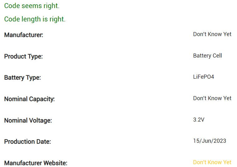 Predajcu som kontaktoval odpoveď prišla v tom duchu, že články pre EV mávajú "znečitateľné" QR kódy. Tam kde šlo kód prečítať, tak mi to našlo, že sa jedná o článok LiFePo, napätie 3.2V, rok výroby jún-august 2023, ale výrobca žiadny a že je to pravdepodobne originál QR kód. Ale tých dekodérov je viac. Mne fungoval len jeden - viď obrázok dole.