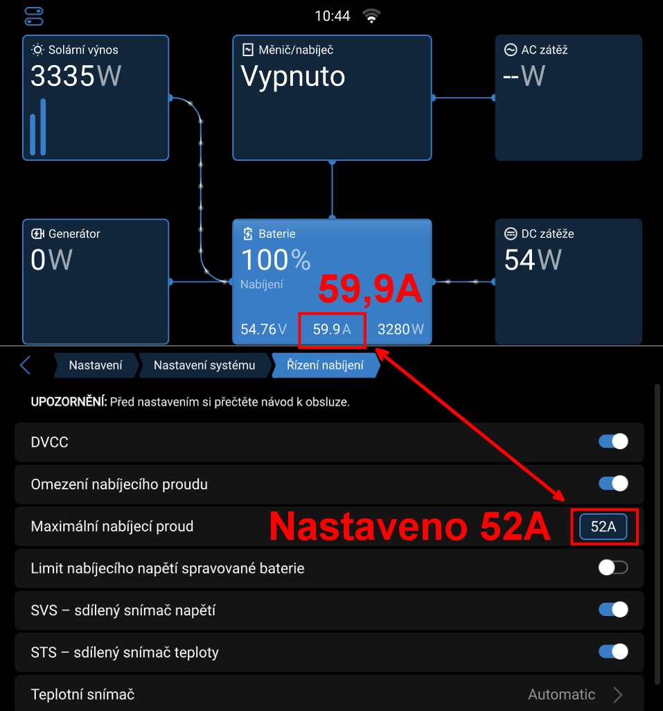 DVCC proud to sice omezilo ale... Změnil jsem DVCC ze 60A na 55A a nabíjení kleslo ze 67,0-67,1 A na 62,7-62,8 A.