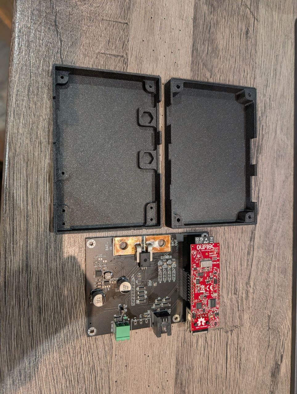 Fyzicky pak jsem to delal tak, ze jsme prepulil napajeci kabel, na nej dal pzen, pripojil datovy kabel (v desce rj45), cele zafoukl do smrstovacky. Samotna deska v krabicce pak sedi primo na baterii. Minus pol pripojeny kratkym kablem a puvodni minus do UPS do krabicky. Pripojene pak jeste mereni napeti nebo napajeni.