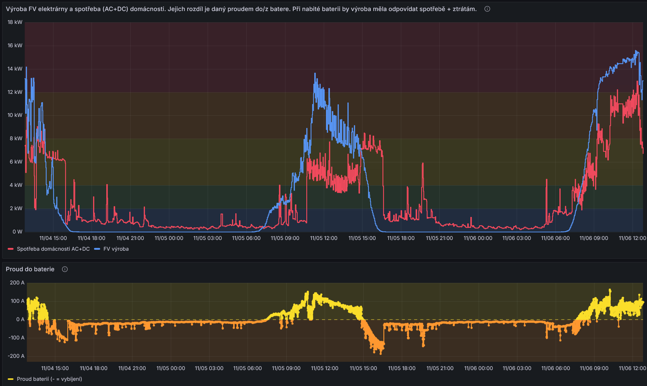 Charakteristika spotřeby domácnosti u nás vypadá nějak takto - přes den vysoká, přes noc nízká: Proto bych mohl přes noc vypínat baterie u elektrárny a nechal pracovat jenom ty ve sklepě. Nízké zatížení zvládnou i staré baterie a ani ztráty v dlouhých přívodních kabelech ze sklepa nebudou vysoké, protože proudy budou nízké.