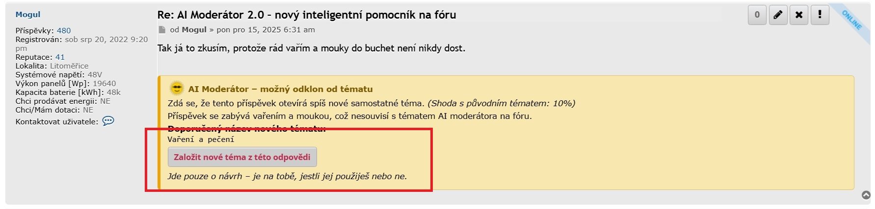 Pokud AI vyhodnotí, že se příspěvek odklání od původního tématu (off-topic), nebo že by bylo vhodnější založit samostatné vlákno, po odeslání příspěvku se autorovi u jeho vlastního příspěvku zobrazí informační hláška s možností založit nové téma z této odpovědi.