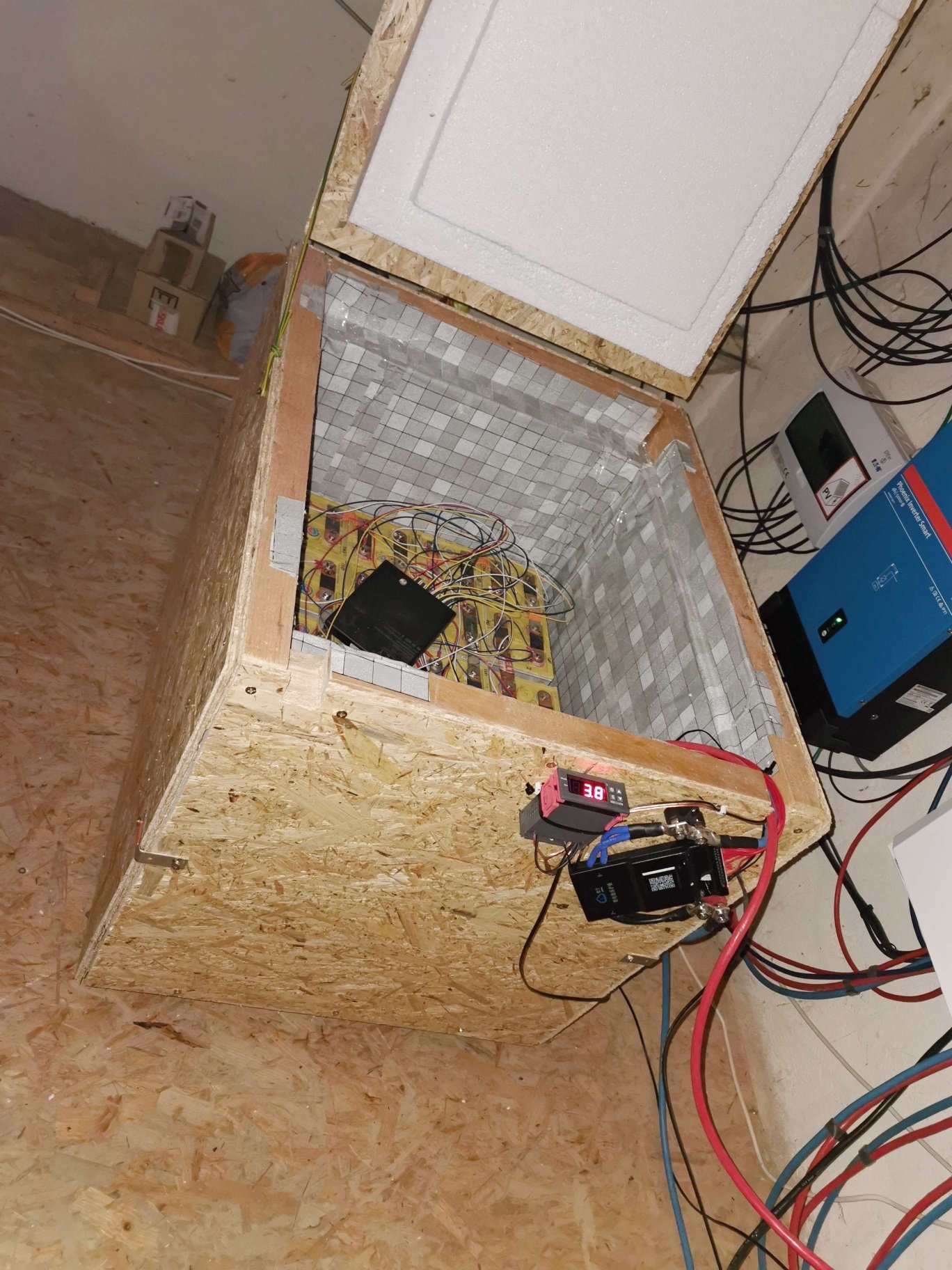 Takže bedna je hotová, termostat nastaven, baterie, BMSka i balancer zapojen. Drátařina ještě neučesaná... Minule jsem zmiňoval, že to je dočasné a vydrželo to pár let. Tak snad tentokrát až bude teplo s tím něco provedu.