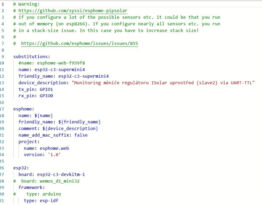 pip3 install -U esphome2x MUST PH1800 5.5kW, 9kWp V+J+Z, 600 Ah LiFePO4 s BMS JBD 200A, SW: Home Assistant na Synology DS923+ ku tomu ESPHome, Tasmota, MariaDB, InfluxDB, Telegraf, Grafana, Zigbee2MQTT..., HW: ESPlan (ESP32 + LAN 8720 + RS485). Nejaké moje projekty: MUST-ESPhome, ELTEK Flatpack2 ESPhome, ESP32-EMON, PZEM-017@WiFi, diyBMS-CurrentShunt-ESPhome , BMS UART-TS485 adaptér