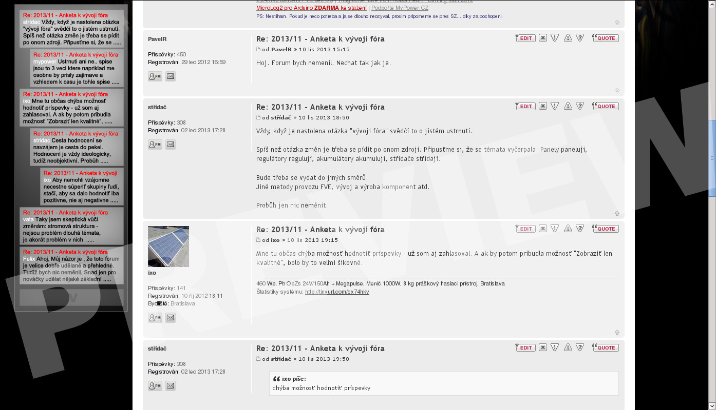 Ustrnuti ani ne.. spise jsou to 3 veci ktere napriklad me osobne by prisly zajimave a vzhledem k casu je tohle spise pruzkum, kterou z tech veci delat prioritne a zbyle zatim nechat spat. V tomto pripade nejde o zasadni zmeny, spise vylepseni. Treba ona stromova struktura by mohla skutecne docela dobre eliminovat vznikajici off topic temata. Na druhou stranu tema oznacene jako VYRESENO by mohlo elegantne resit temata, ktera nyni maji 15 stran, nikdo to uz cele nebude cist a nekolikrat dokola se tam resi totez, co uz je davno drive vyreseno. Hodnocenim se zavadi neco jako autodetekce kvality prispevku. Kvalitni prispevky se daji napriklad prioritizovat ve vyhledavani a forum tak muze byt zdrojem jeste relevantnejsich informaci a balast byt potlacen ...střídač píše:Vždy, když je nastolena otázka "vývoji fóra" svědčí to o jistém ustrnutí.
