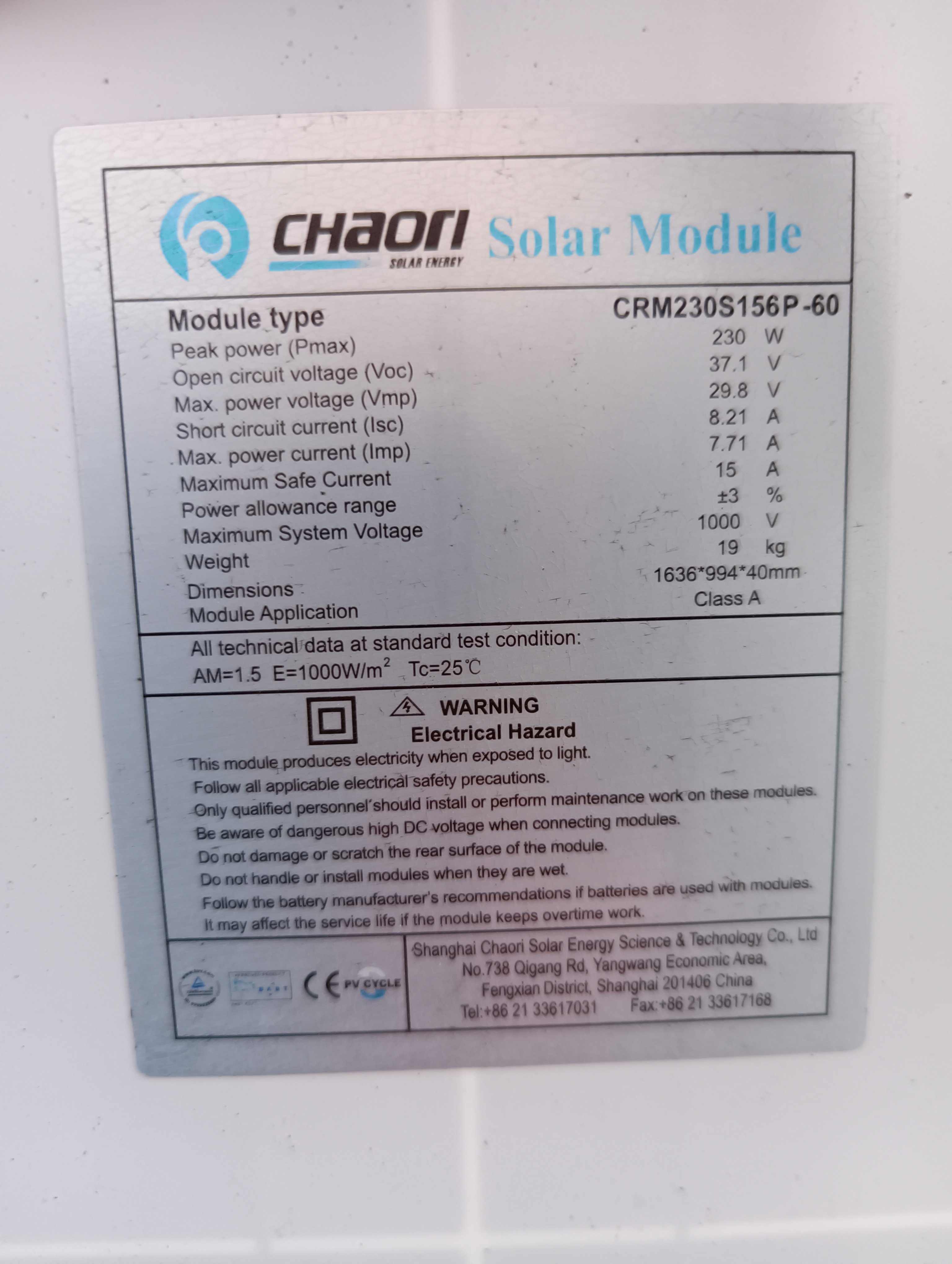Re: 260Wp - polykrystal Chaori CRM 230S156-P60