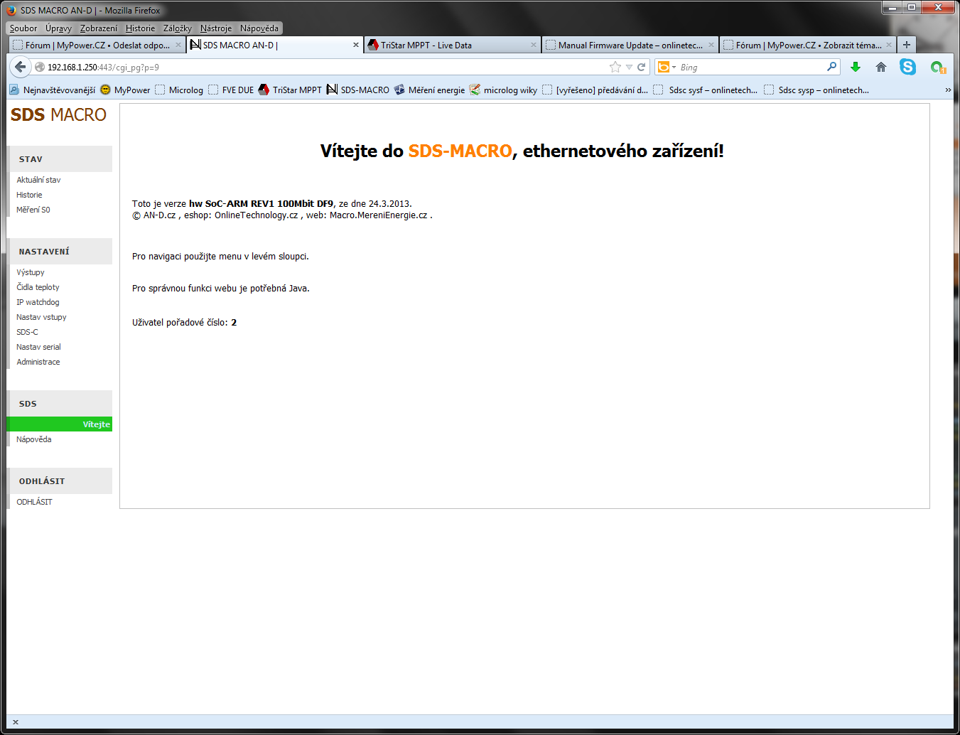V SDS se mi moc nechce firmware měnit, dle komunikace na fóru (měření energie) vata - tamější admin jsou nějaké potíže s novým fimware 301113. Já tam mám o fous starší 240313 a vše mi na tom funguje, tak bych nerad něco pokazil. Minule jsem se snažil upgradovat micro a musel jsem jej poslat zpět výrobci, protože se mi to nějak zaseklo a nešlo s tím nic dělat. Uvidím dám si silnější kafe a třeba se rozhudnu firmware v sds updatovat
