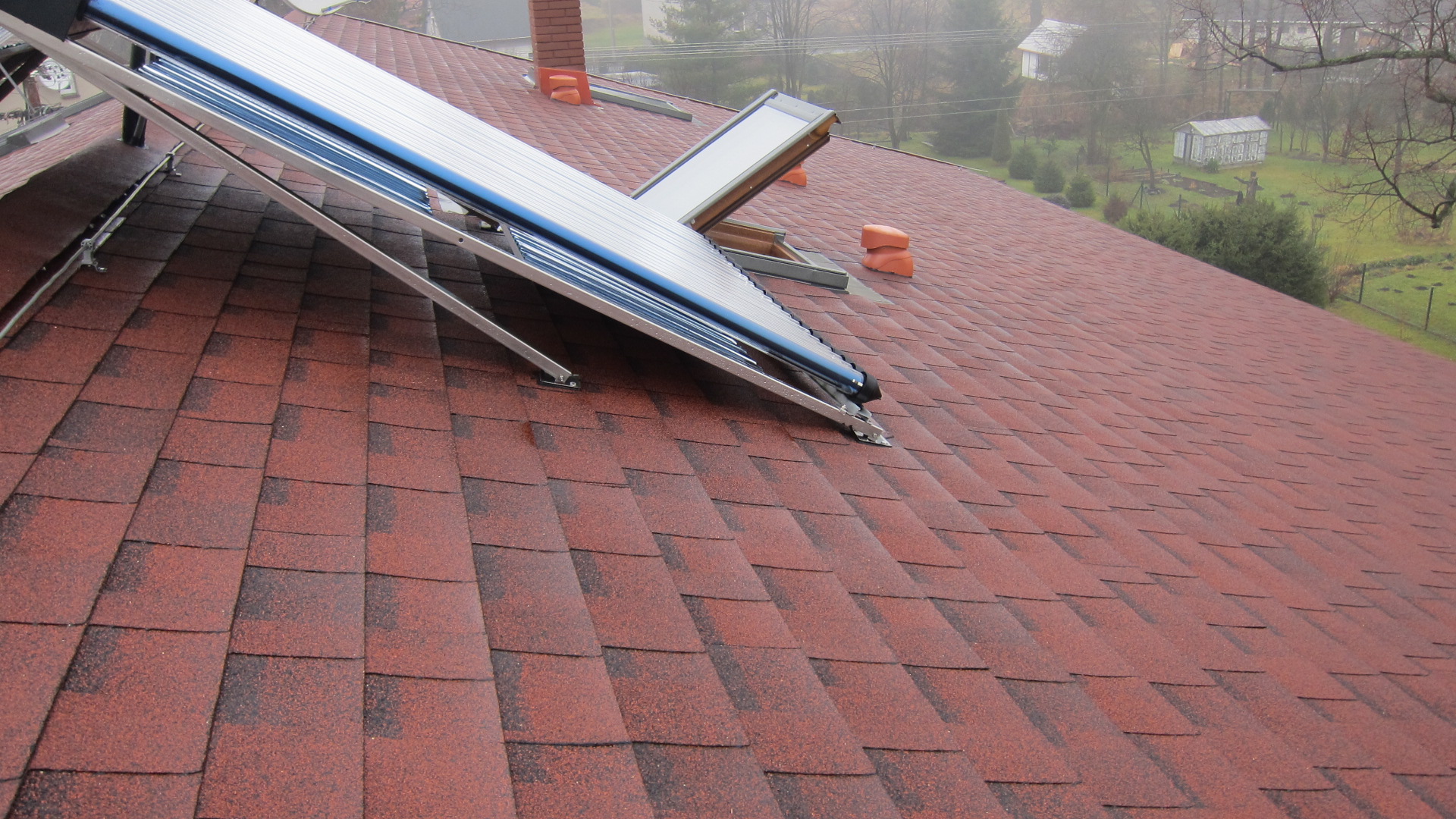 Ano ta parbola tam je na tom stožáru.Počítám ale že ty panely rozdělím na východ a západ.Potom by nestínila dopolede východní a odpoledne západní stranu.Tak jsem to ještě nafotil pro upřesnění.Sklon střechy je 19 st.Rozměr střechy 13,5 m x 6,5 m.Na východní straně je to od spodu střechy k těm větrákům 4 m.Na západní straně je k těm oknům od spodu střechy 5 m.Tak spíš bych uvažoval dát ty panely do těch spodních částí.