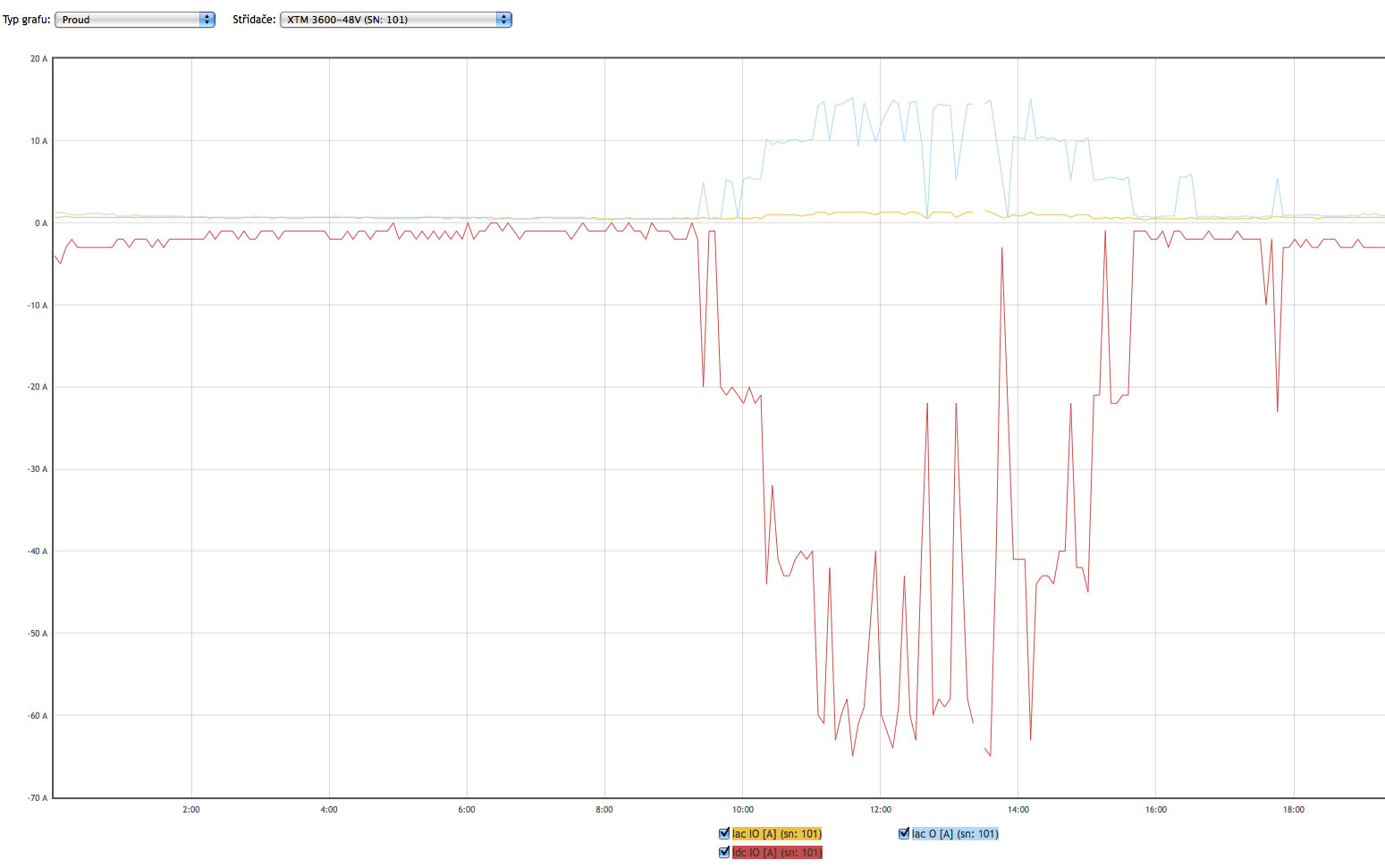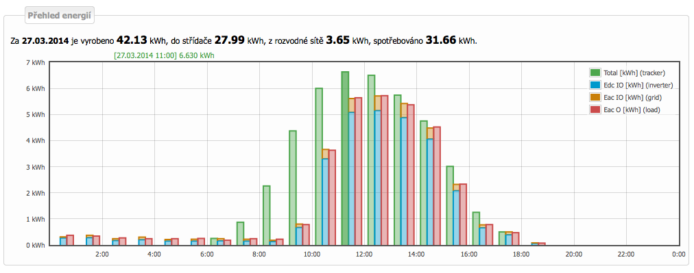 Pro zájemce o podrobnější informace o provozu hybridní FVE v RD jsem si dovolil podělit se o dnešní data. Grafy z HFVE běží na chytré krabičce s názvem Solarmonitor.