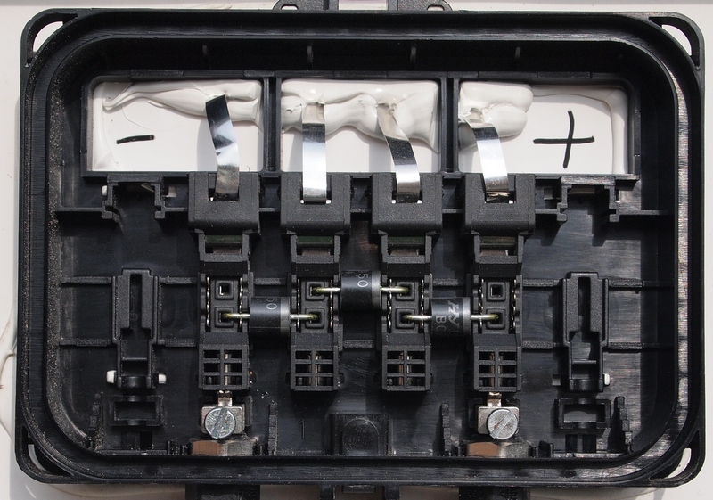na diode v serii je ubytek napeti vynasobime-li to protekajicim proudem, mame celkem slusne ztraty na diode. Proto fuj, ale pojistka na tom neni o moc lepe nehlede k tomu, ze za ni musis lezt na strechu.
