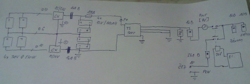Regulátory jsou dva, aby se hlídal jen pár baterií. Tedy po 24V. Ze skušenoustí z IT prostředí je lepší více krabiček, než vše v jednom.Gmouse píše:Můžu se zeptat proč zapojení s TS-3000 a 2 x Phocos. Nevyšlo by levněji vypustit ty regulátory a použit TN-3000?