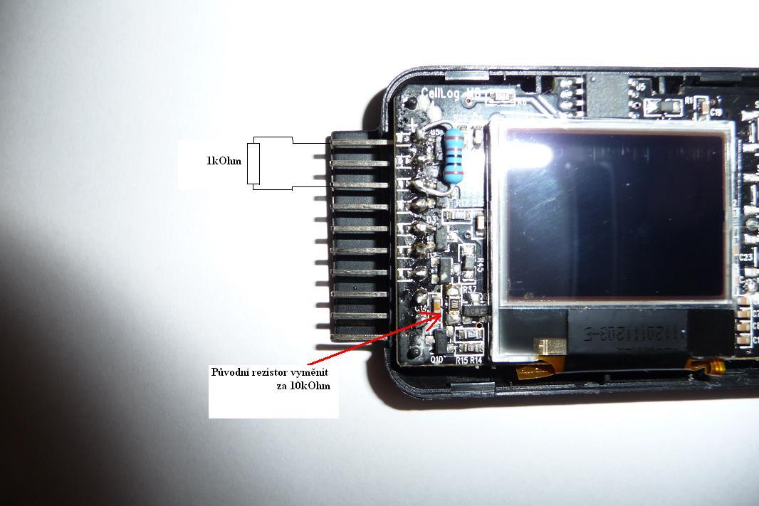 1. výměnit origo SMD rezistor 2kOhm (202) vlevo dole u displeje za 10kOhm (1002) . S původním rezistorem je odběr CellLogu cca 11mA , s 10kOhm rezistorem klesne odběr na cca 6,0 až 6,5mA , což je za rok nonstop provozu úspora kolem 42Ah což není málo