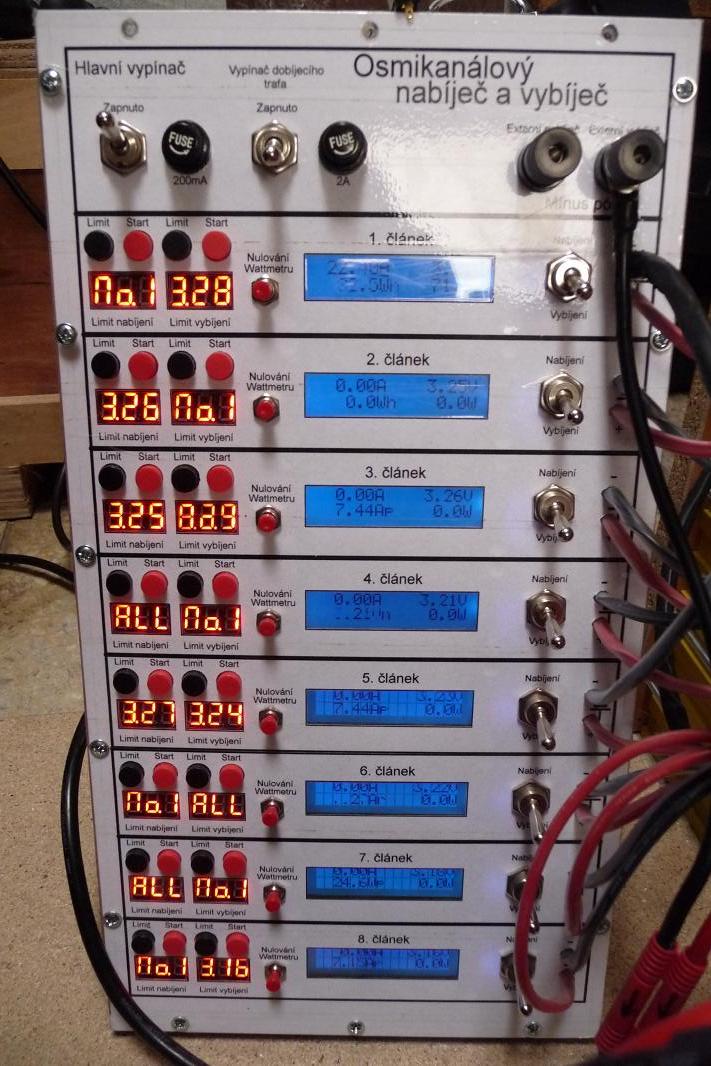 V diskusi je představena vlastní konstrukce 8-mi kanálové nabíječky a vybíječky pro LiFePO4 články, která umožňuje samostatné nabíjení či vybíjení až osmi článků s proudem až 7A na kanál nebo 56A na jeden článek. Zařízení nabízí galvanické oddělení kanálů a možnost připojení externí nabíječky či vybíječky pro rychlejší provoz. Autor sdílí první zkušenosti s měřením pomocí wattmetrů a postupné ladění konstrukce, která je stále ve vývoji.