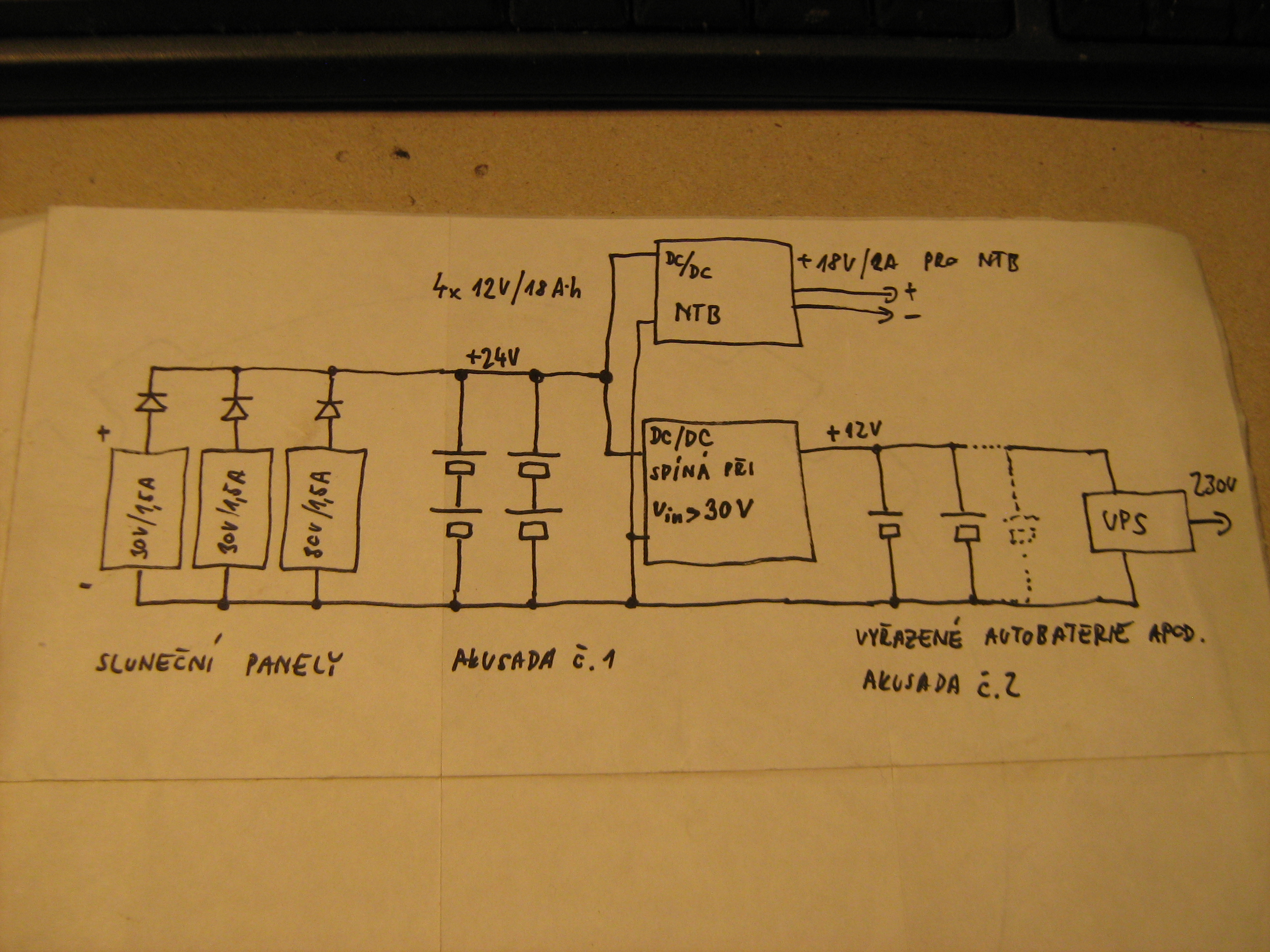 takhle primitivně je to zapojené. horní DC měnič pro NTB se vypíná při 24,6V, to je ochrana proti podbití a dolní měnič - "přepad" se spíná při 29-30V a pustí přebytky do 12V aku a do UPS. ty měniče jsou jeden evalboard od national semiconductor a druhý je z Ebaye už si to přesně nepamatuju je to co dům dal