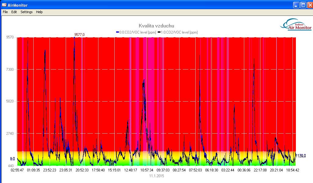 Konkrétně tento typ se už bohužel nedodává, ale možná je k dispozici nějaká inovovaná verze. S tímto čidlem jsem velmi spokojen. V době, kdy jsem jej kupoval stálo kolem 600 Kč a za tu cenu funguje jednak jako hrubý indikátor prostřednictvím tříbarevné LED, ale také jako autonomní logovací zařízení (má vlastní paměť) nebo jako poměrně citlivé čidlo s velkým rozsahem a možností elektronické kalibrace. Byl k němu dodáván i jednoduchý program pro monitorování kvality vzduchu. Na přiloženém obrázku je záznam ze dvou čidel vzdálených cca 30cm. Rychlost reakce je vysoká a shoda naměřených výsledků také. Ta krátkodobá špička ve znečištění vzduchu je v důsledku vaření na zemním plynu. Z rychlosti pádu hodnot do zelených čísel lze usuzovat na výkon rekuperace.