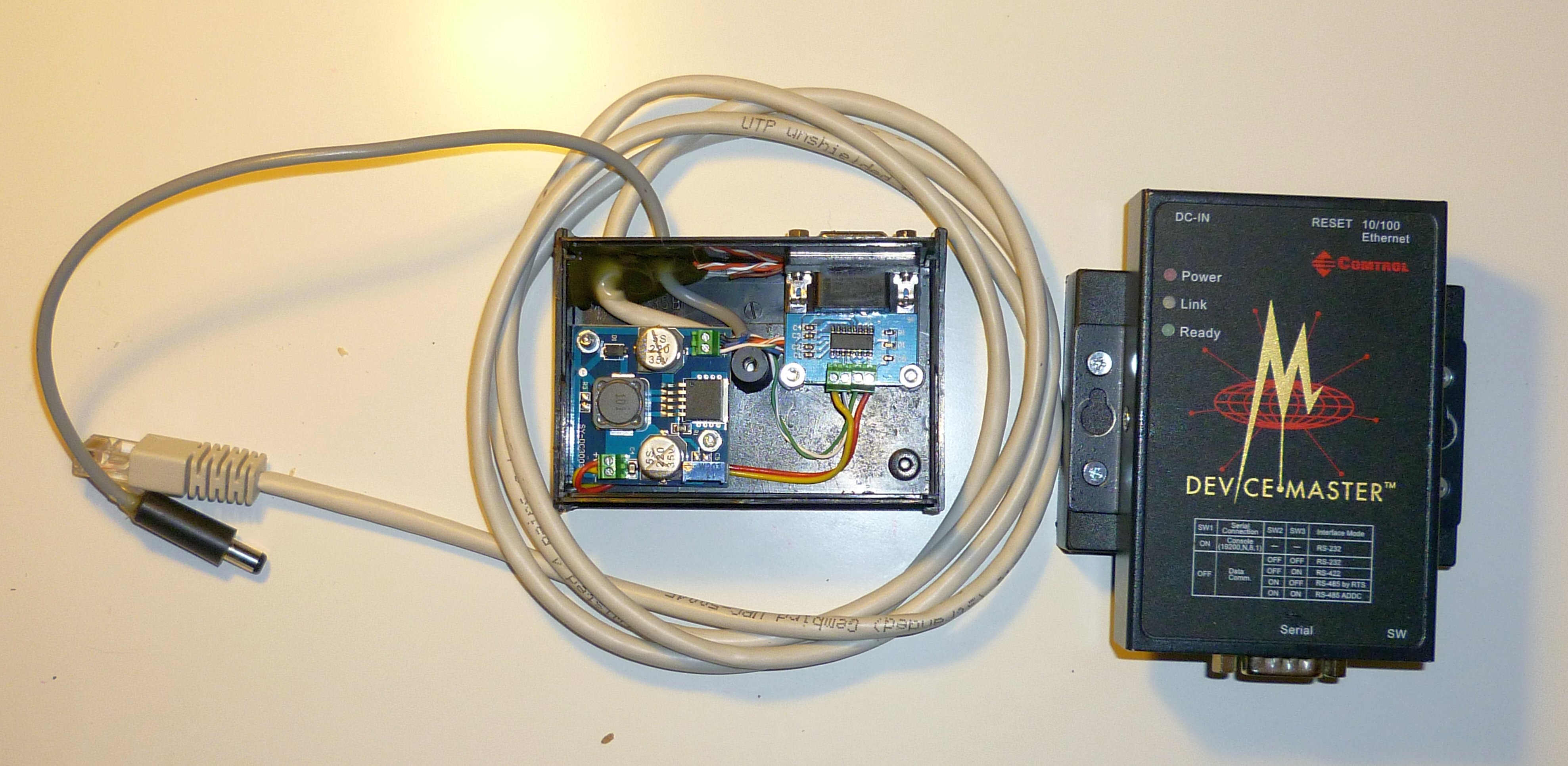 Prevodnik z TTL urovni regulatoru na RS232 a ethernet pro vzdalene sledovani hodnot z regulatoru. V cerne krabicce je na leve strane DC/DC menic z 12V poskytovanych regulatorem na 5V pro napajeni prevodniku TTL/RS232 a v prave casti je prevodnik urovni samotny. Vpravo je pak prevodnik RS232/ethernet. sedy kablik s napajecim konektorem je pro napajeni ethernet prevodniku primo z regulatoru.