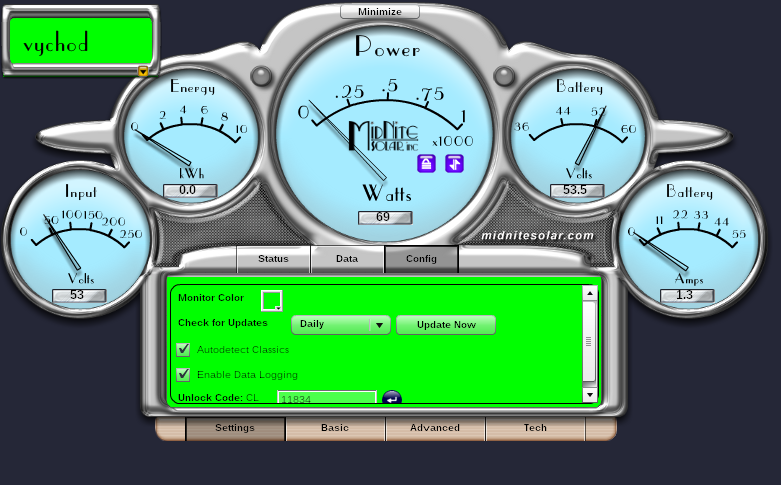 nenabíjel ani když bylo napětí z panelů nad 160V. Polykrystaly již dávno vyráběli a amorfy nic. Tak jsem změnil MPPT mód na Legacy P&O a Midnite začal nabíjet 69W a napětí z panelů bylo 53V a tedy níže než napětí akumulátoru 53,5V: Mód Dynamic se mi zdál ještě lepší, i když už začínalo rychle svítat, ale nechal jsem tam ten Dynamic: Zkoušel někdo ten MPPT mód také měnit a třeba i na jiných panelech (polykrystal, monokrystal) a jaké byly výsledky?
