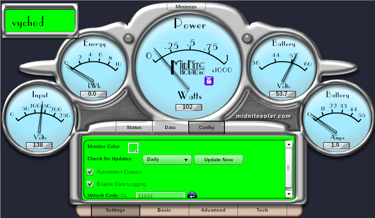 můj Midnite poránu také vstává do práce později než panely - čeká až je na panelech víc jak cca 30W (35W spotřebuje samotné MPPT) . Pokud se mu vůbec nechce makat , tak pomůže Config