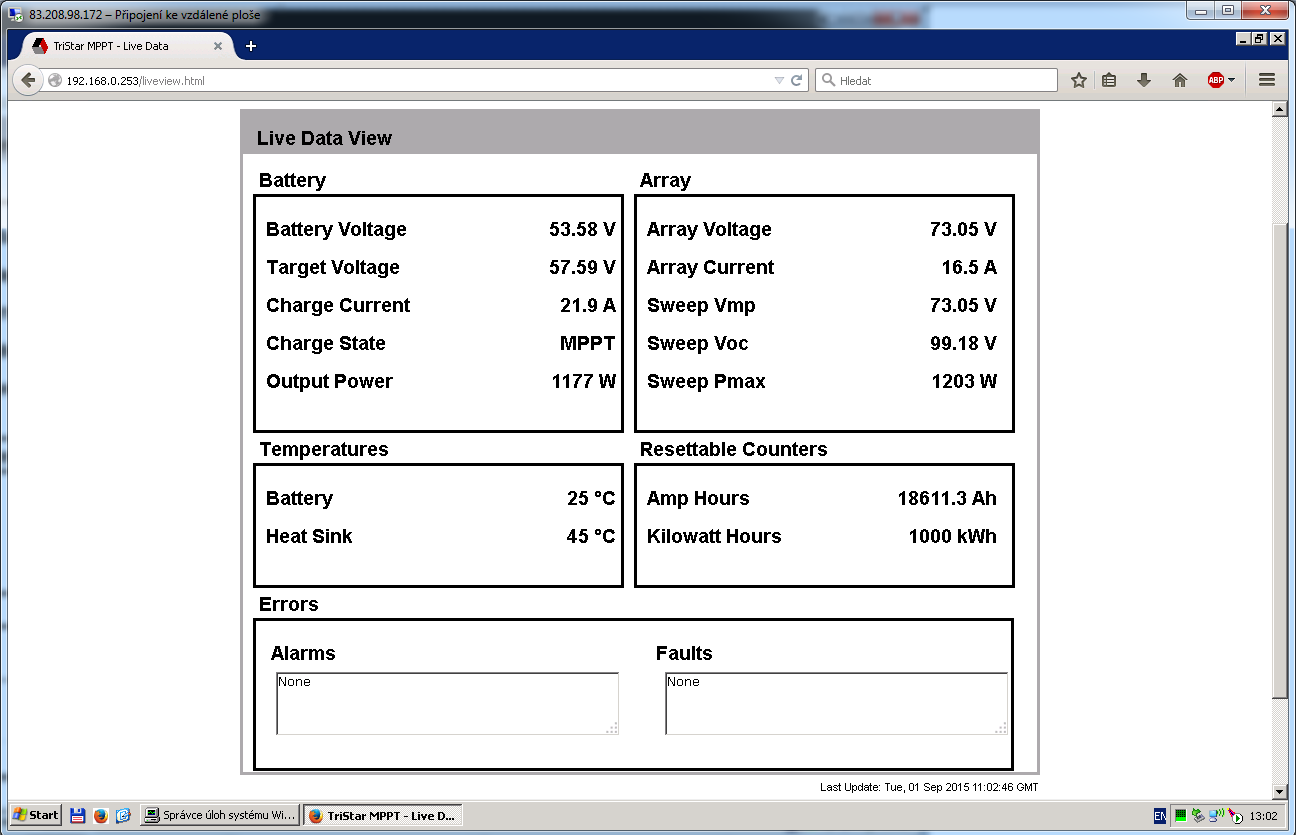 Dáme update. Téměř po roce budu opět zprovozňovat VFE. Momentálně běží 1440Wp s reguátorem epsolar 40A na dvou baterkách 150Ah a měničem Voltraft 1200W. Jsou to ty moje první baterky a stále ještě fungujou